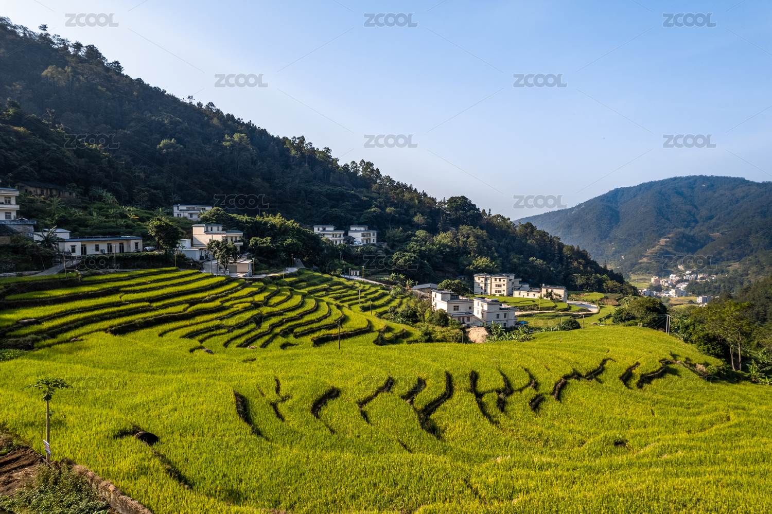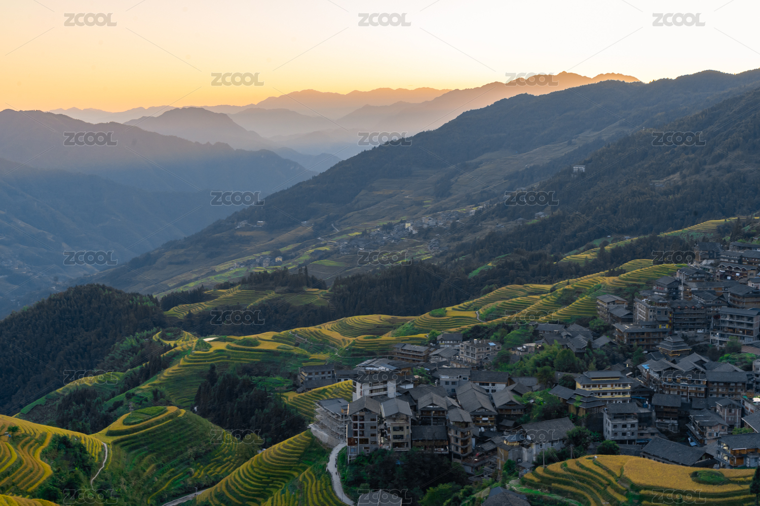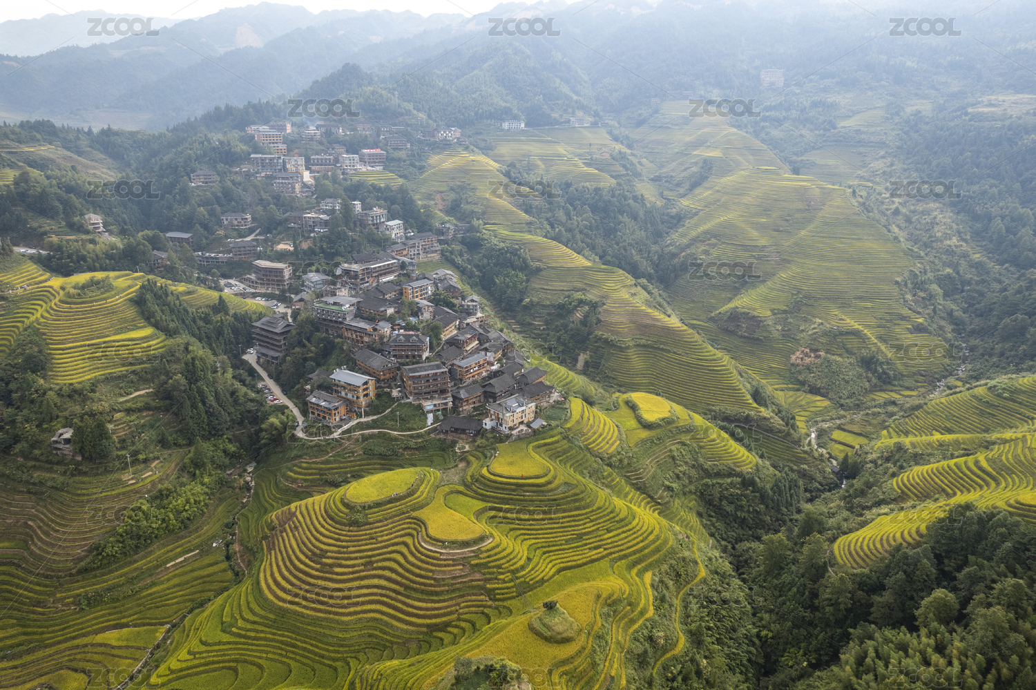 广西初秋阳光下龙脊梯田村庄