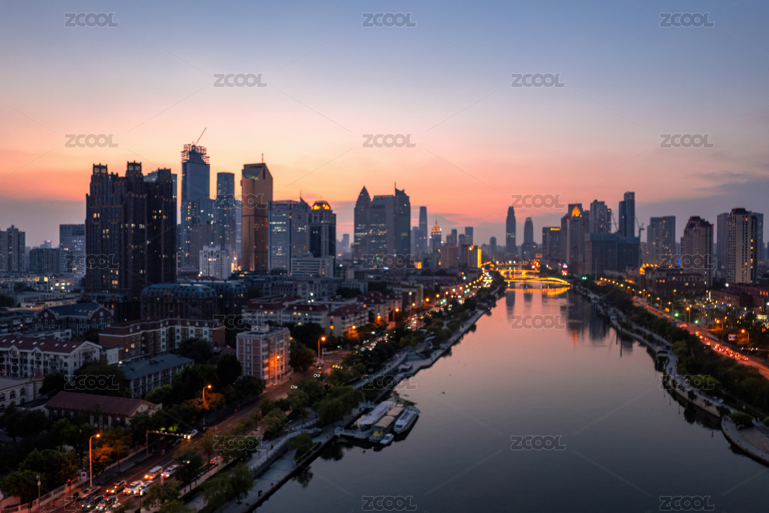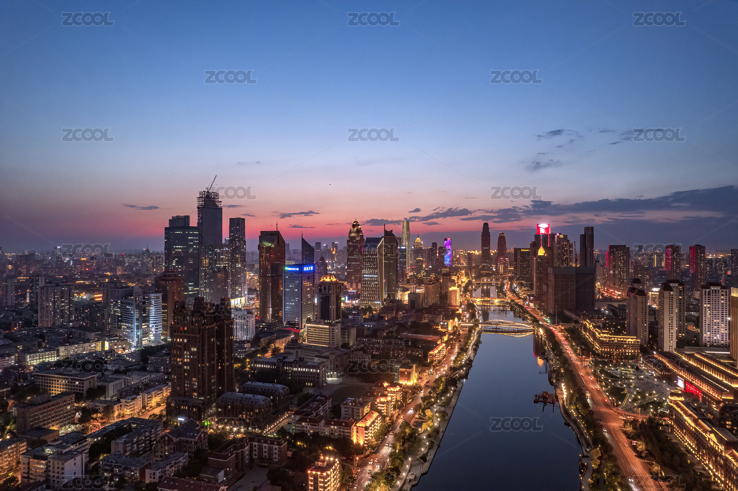 日落天津海河金阜桥小白楼商圈城市建筑风光