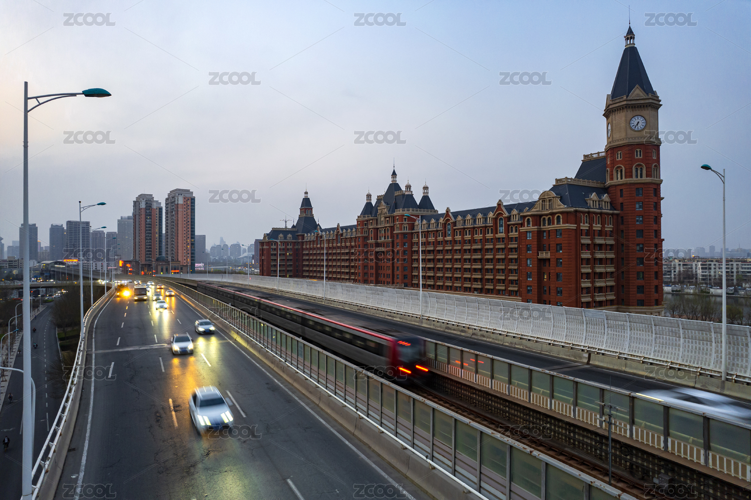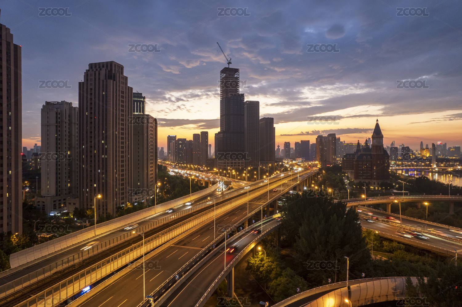 日落晚霞天津海河海津大桥城市建筑夜景街道