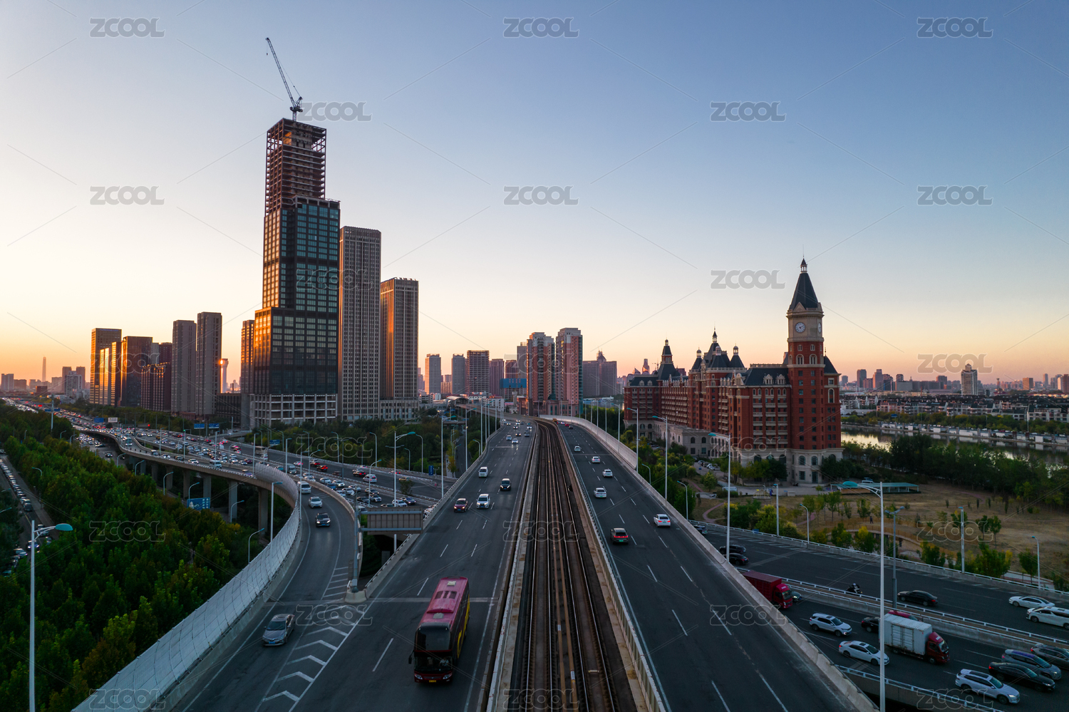 天津海河富民桥沿岸城市建筑日落风光航拍