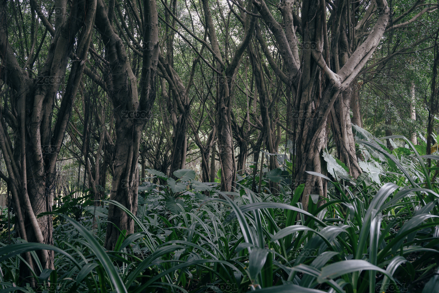 夏天户外弯曲的绿色茂盛的森林树木树干树枝