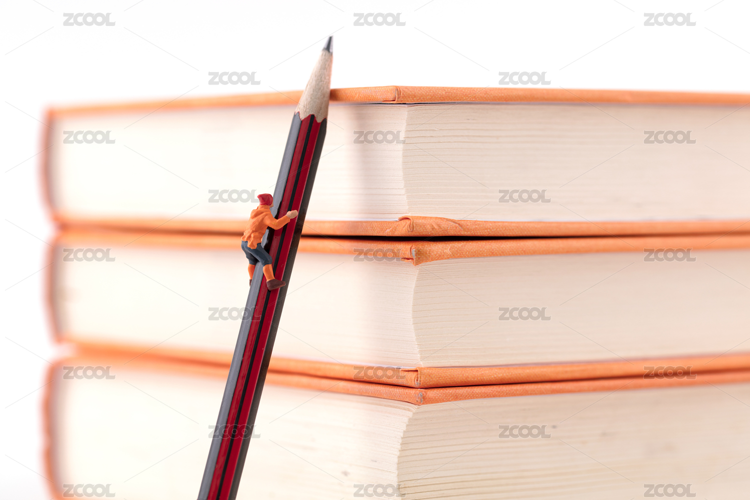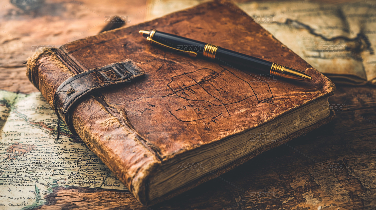 俯视桌子上的古旧书籍和毛笔及放在书上的一碗茶
