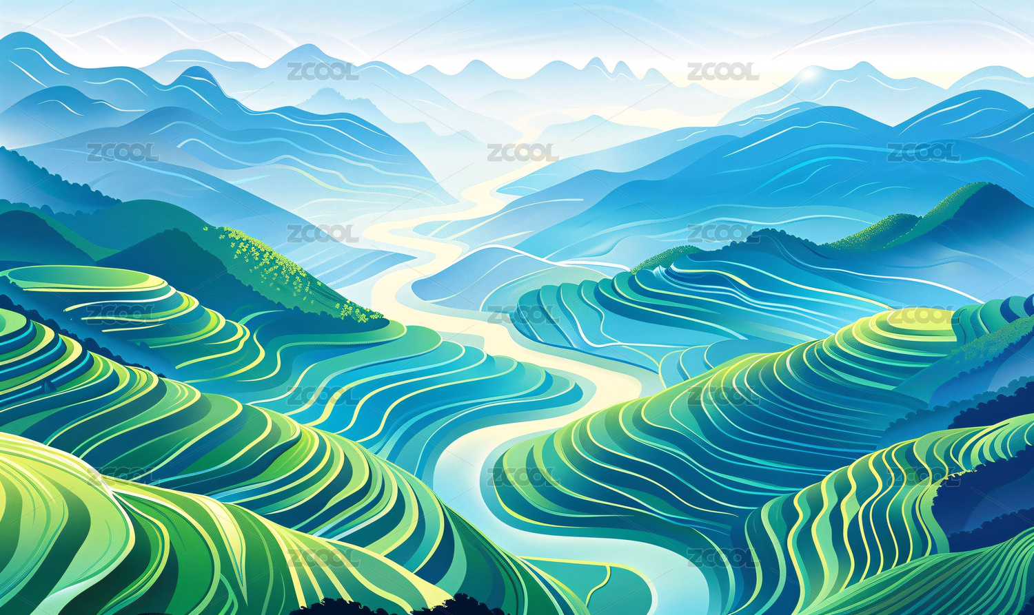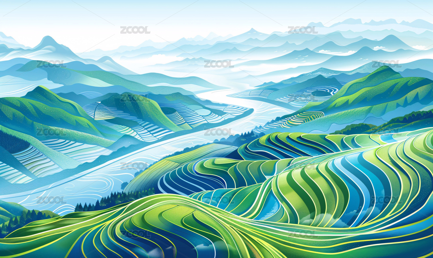 插画,自然,田地,农业,户外,自然美,绿色,梯田,茶田,风景