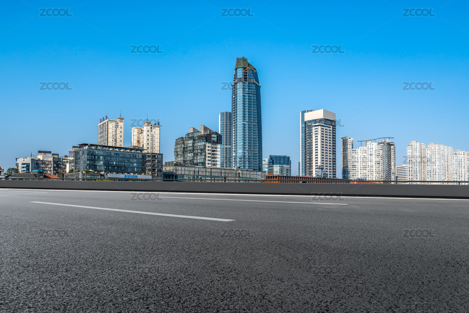 中国武汉空旷的柏油马路和现代城市建筑天际线