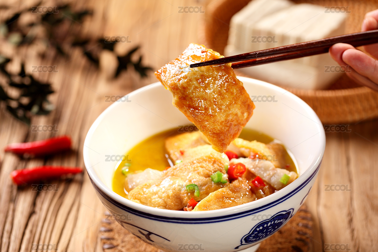 筷子夹起的卤汤臭豆腐