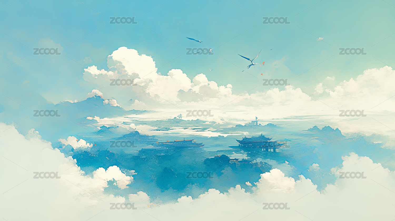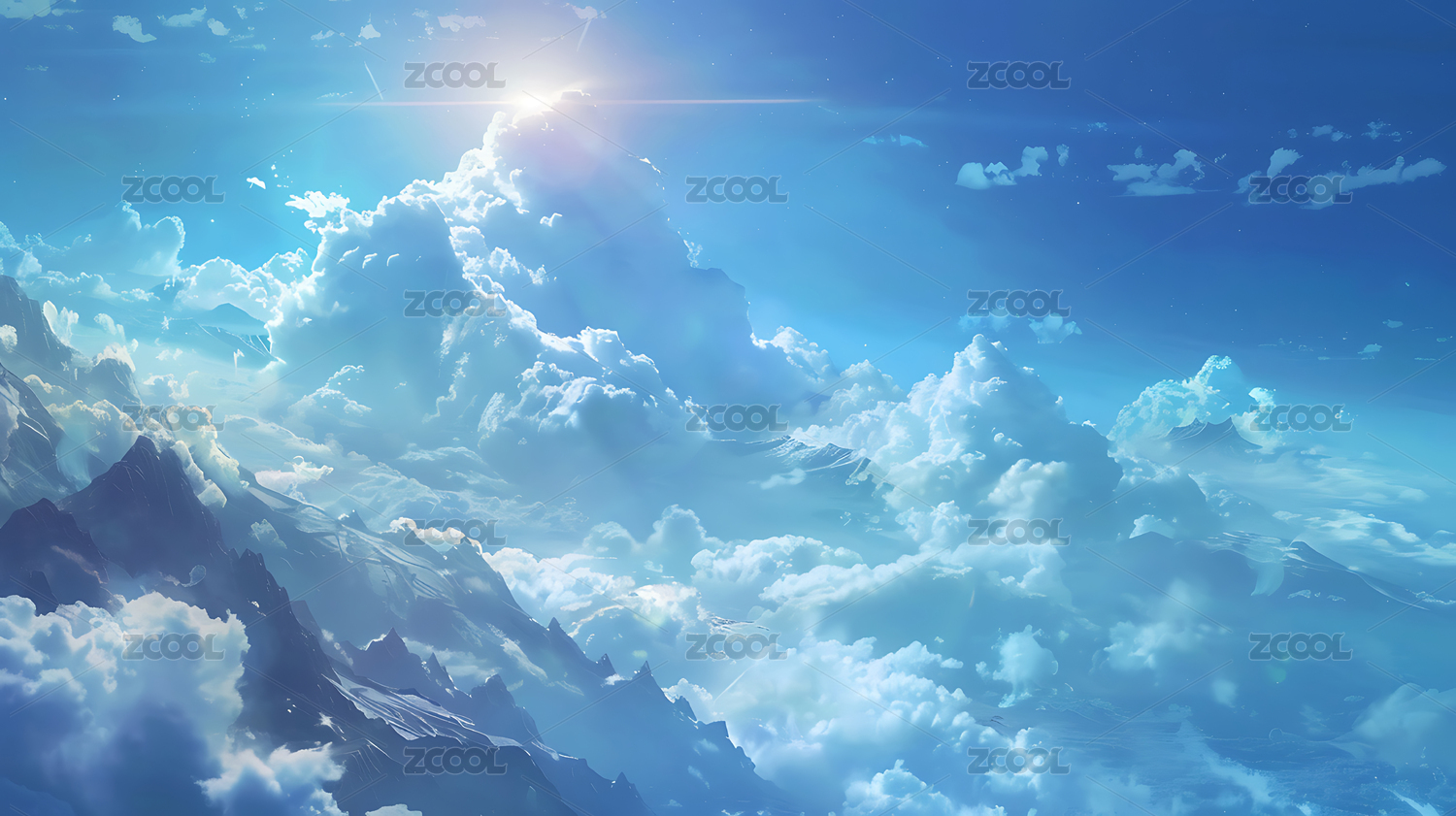 蓝天,云海,山川,远山,横构图,白云,树,远景,蓝色系,山