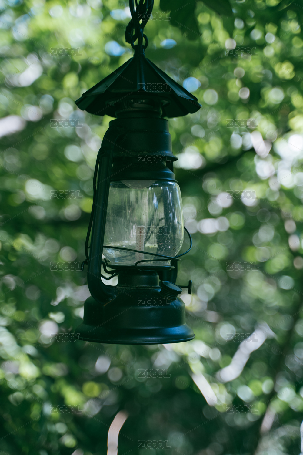 户外花园里悬挂的灯具特写