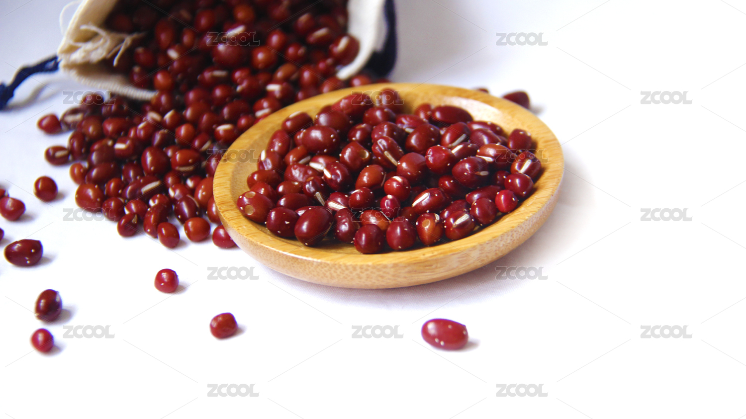 白底上的红豆上放着一木盘红豆