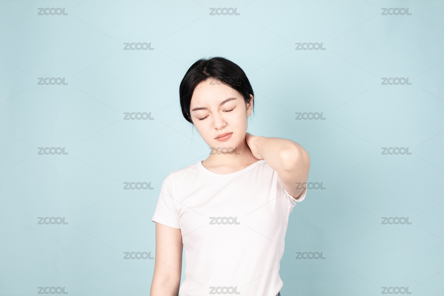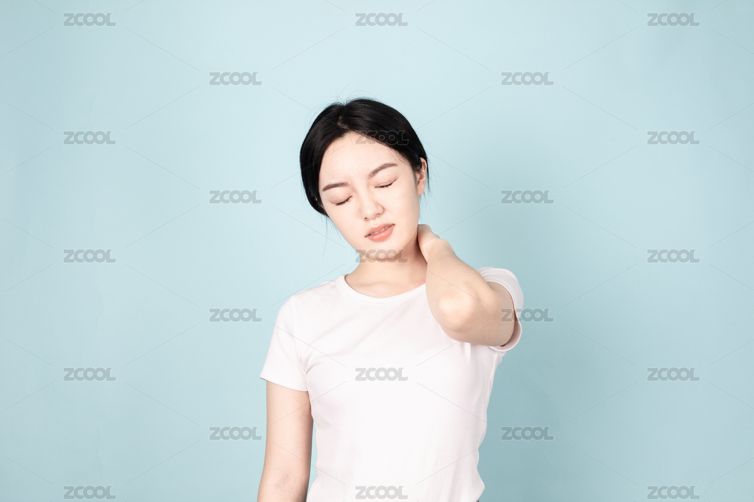 一位亚裔女孩站在纯色背景墙前托着脸颊闭起双眼