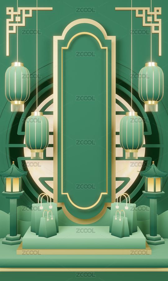 模板,国潮风,新中式,绿色,金色,中国文化,清新,三维图形,插画,节日
