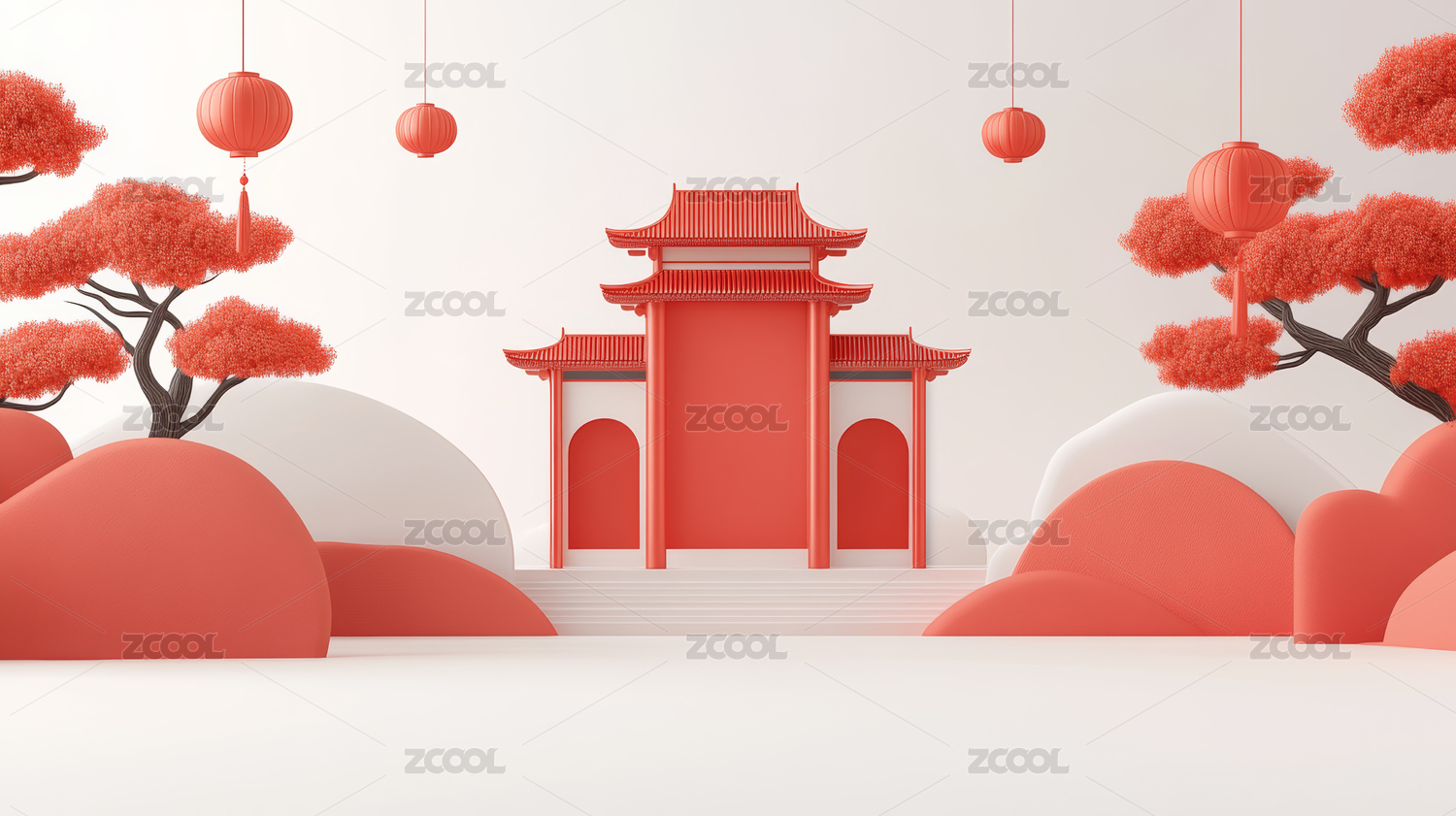 3D春节红色古代建筑大门电商产品展台