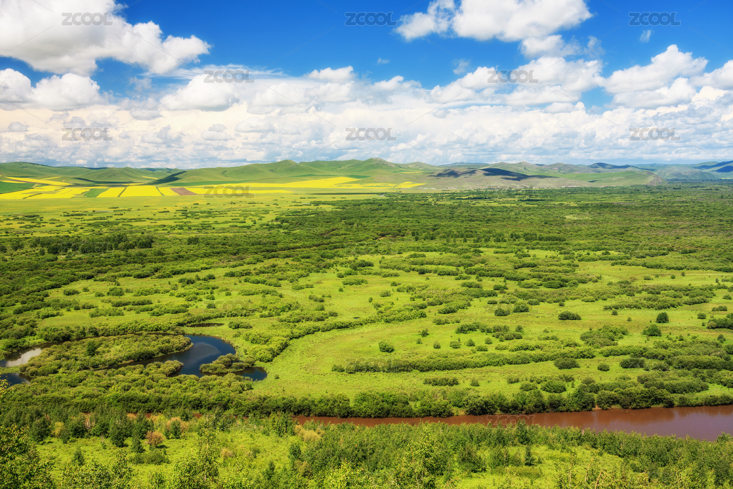 草原,河流,河,池,湿地,公园,农村,油菜花,农作物,植物