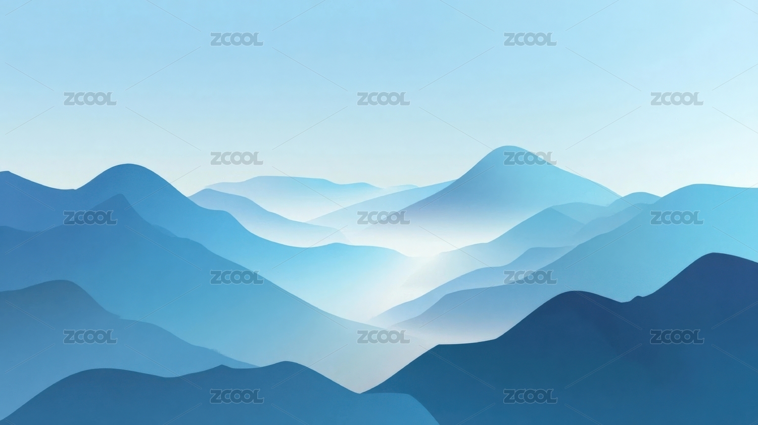 淡蓝背景下群山层叠朦胧展现诗意水墨山水意