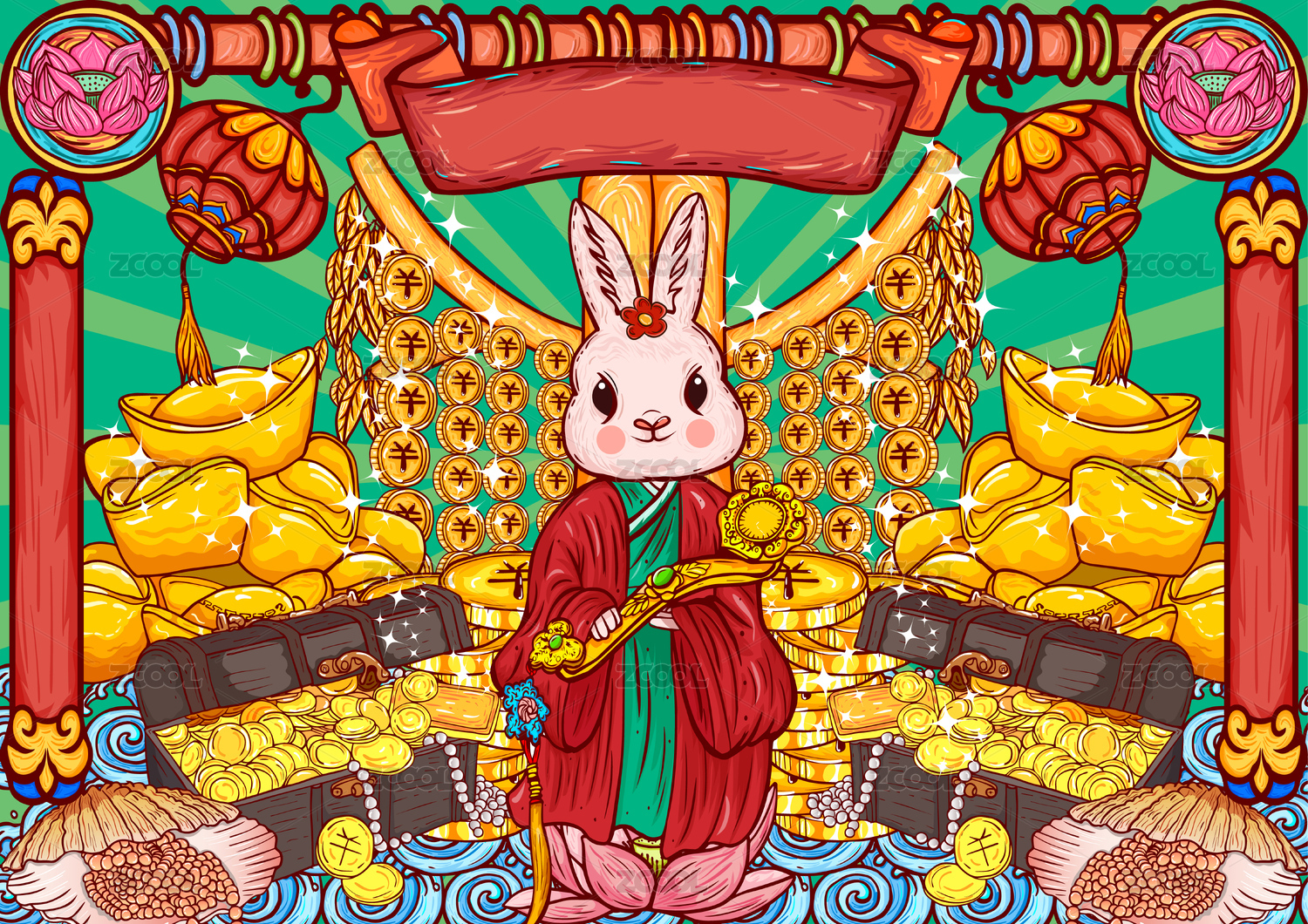 矢量国潮喜庆兔子抱如意荷花聚宝盆春节插画