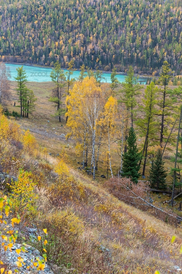 中国新疆布尔津喀纳斯河森林秋天自然风景