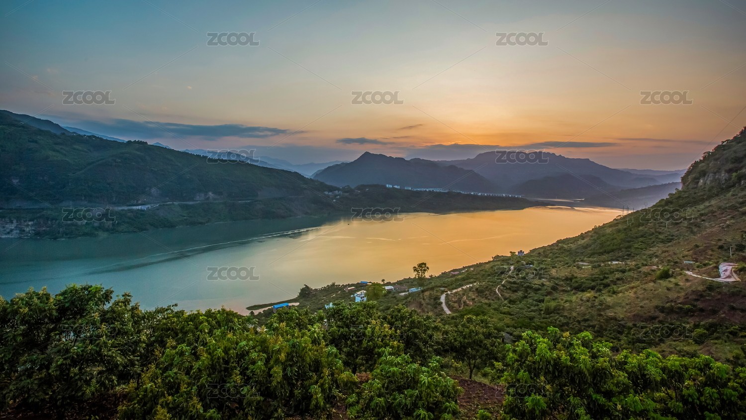 四川宜宾金沙江向家坝库区日落晚霞山水风光