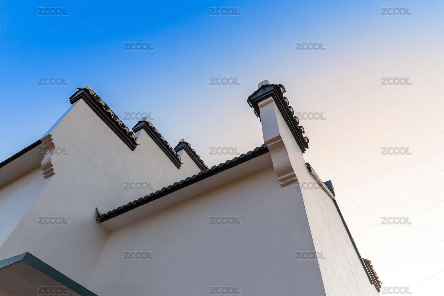 中国南方民居白墙灰瓦建筑及蓝天背景