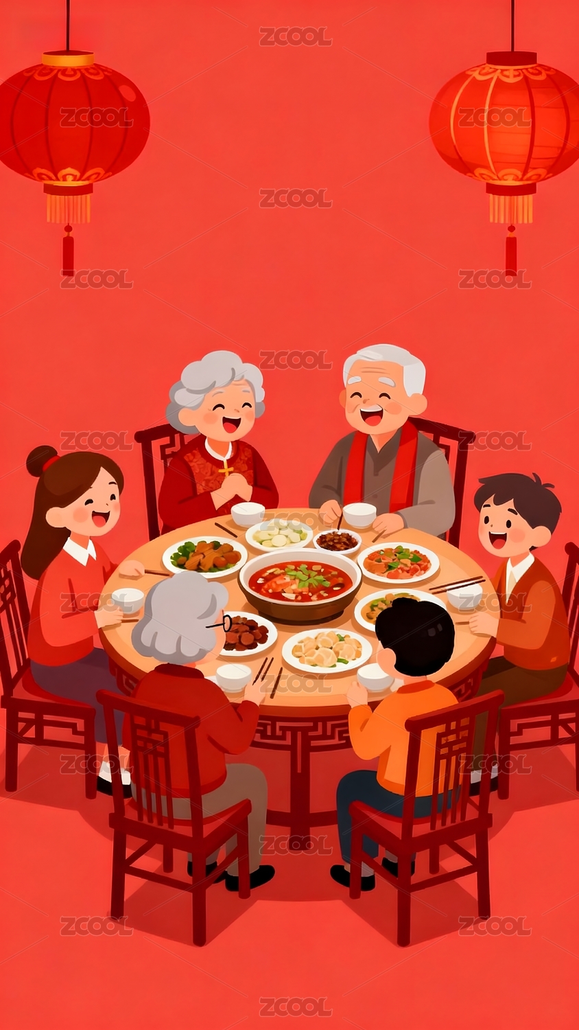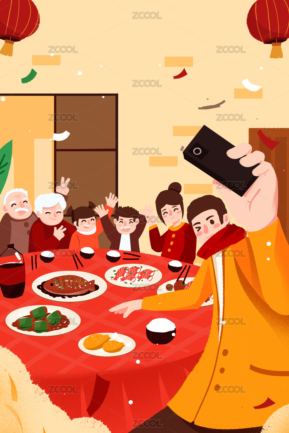 年夜饭,传统节日,团圆,合影,春节,新年,插画