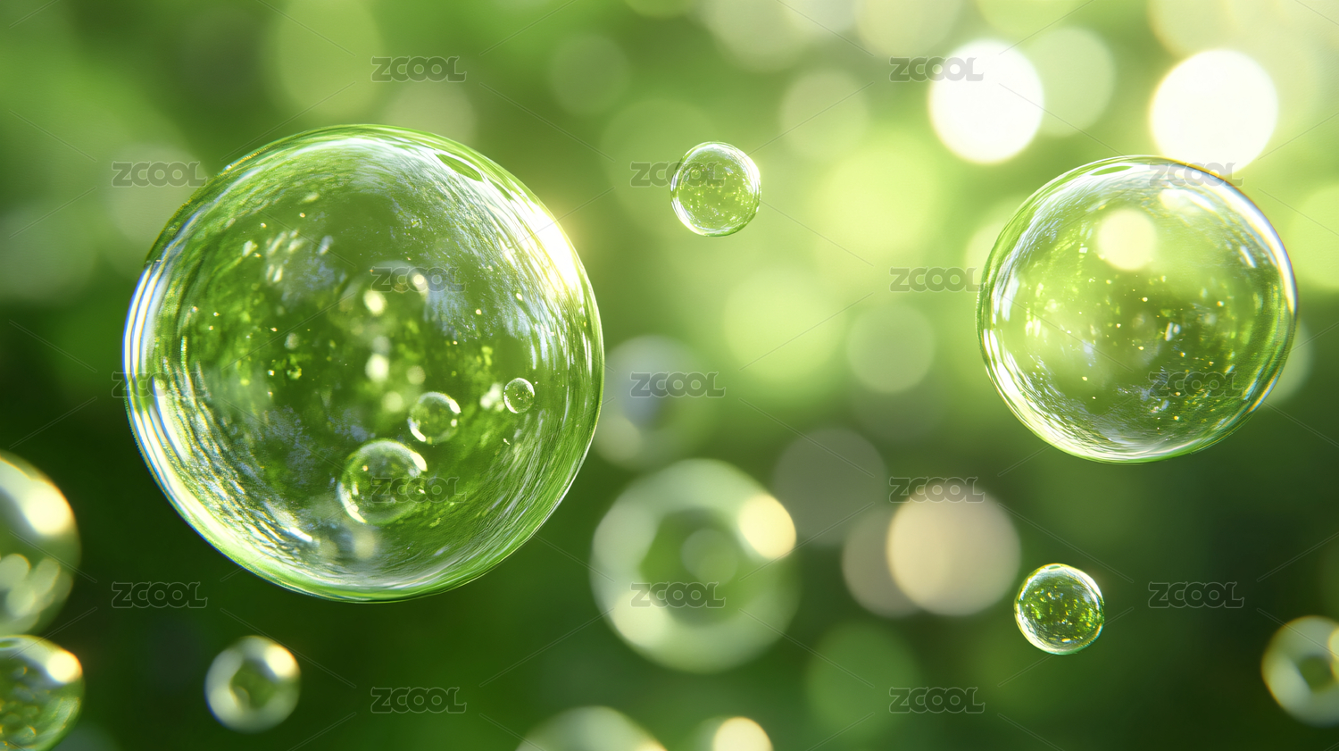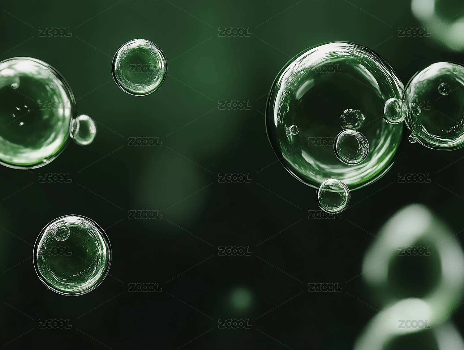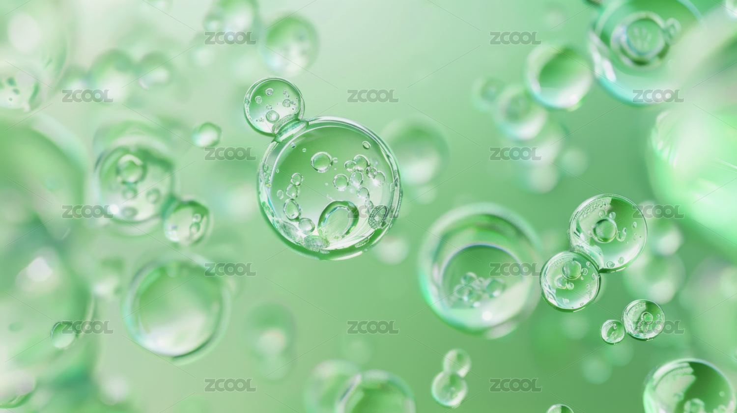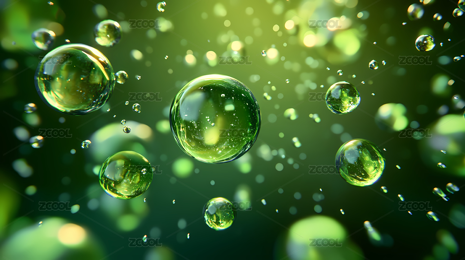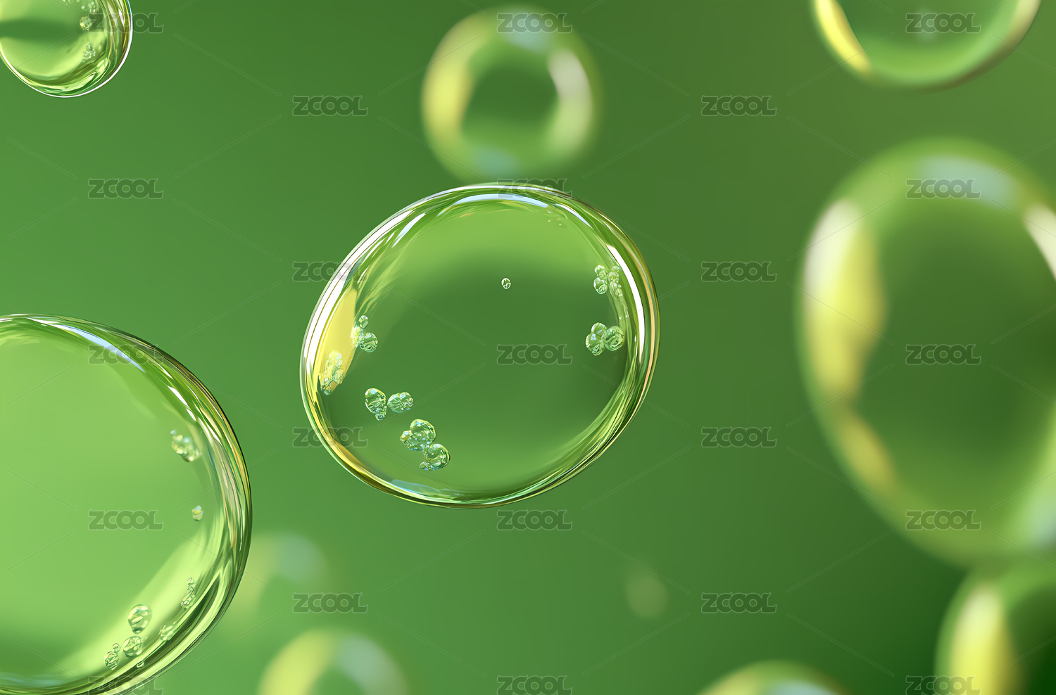 光滑水面绿色背景中的泡泡化妆品成分插图