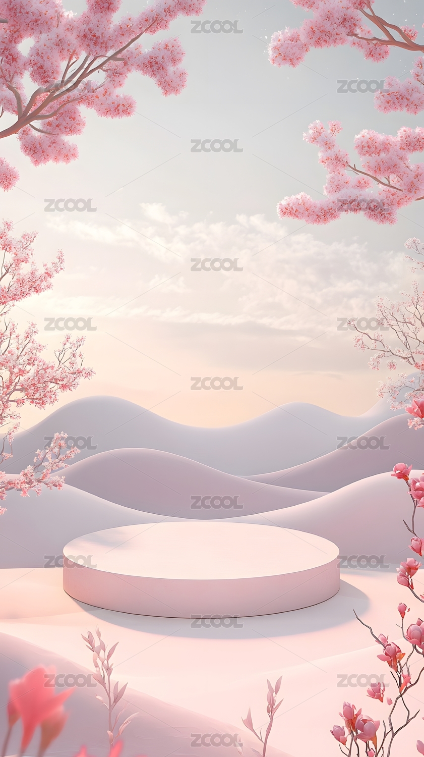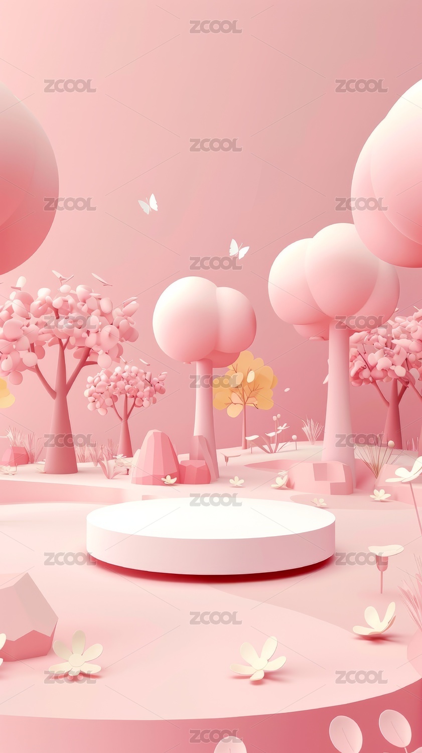 产品展台背景:3D粉色森林树木产品展台背