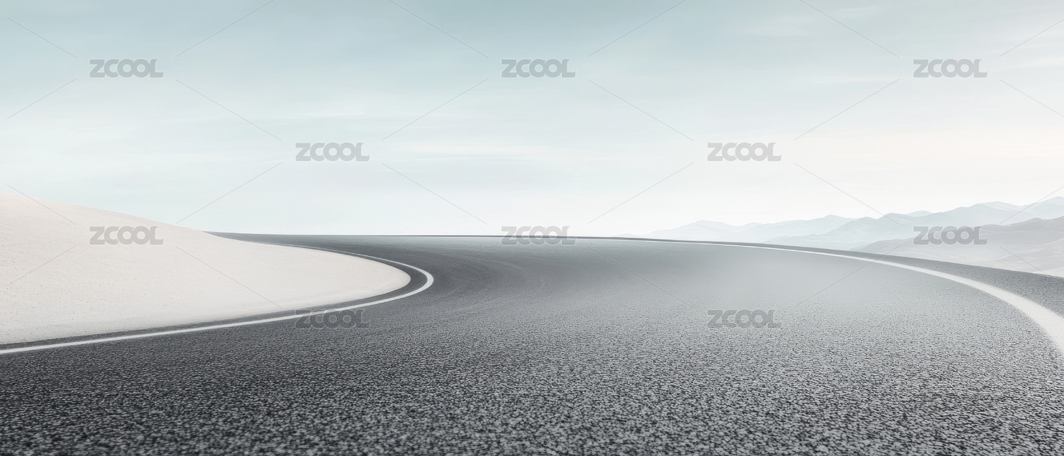 蓝天下无人的沥青路面与远处连绵起伏的山脉