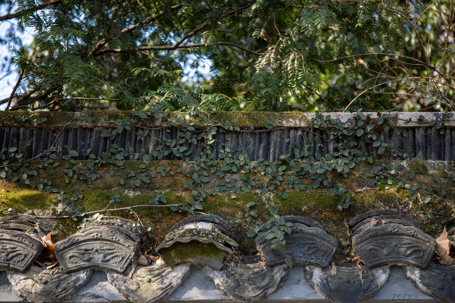 成都杜甫草堂青苔覆盖古建筑屋檐和银杏树