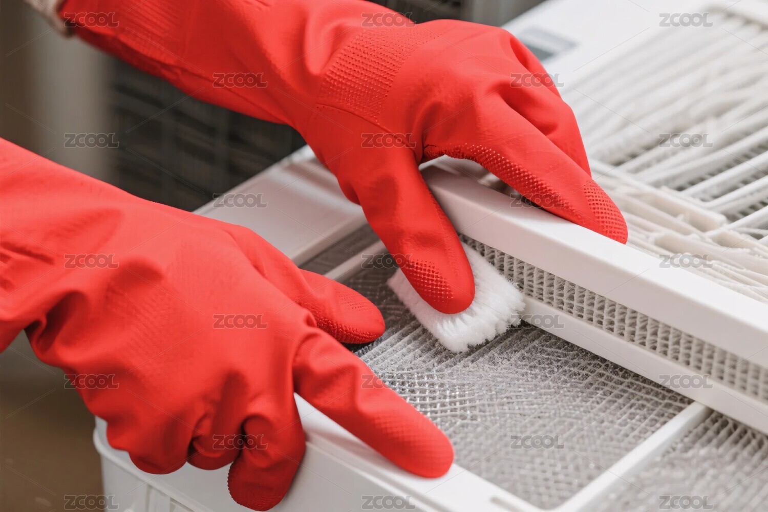 戴红手套清洁空调滤网