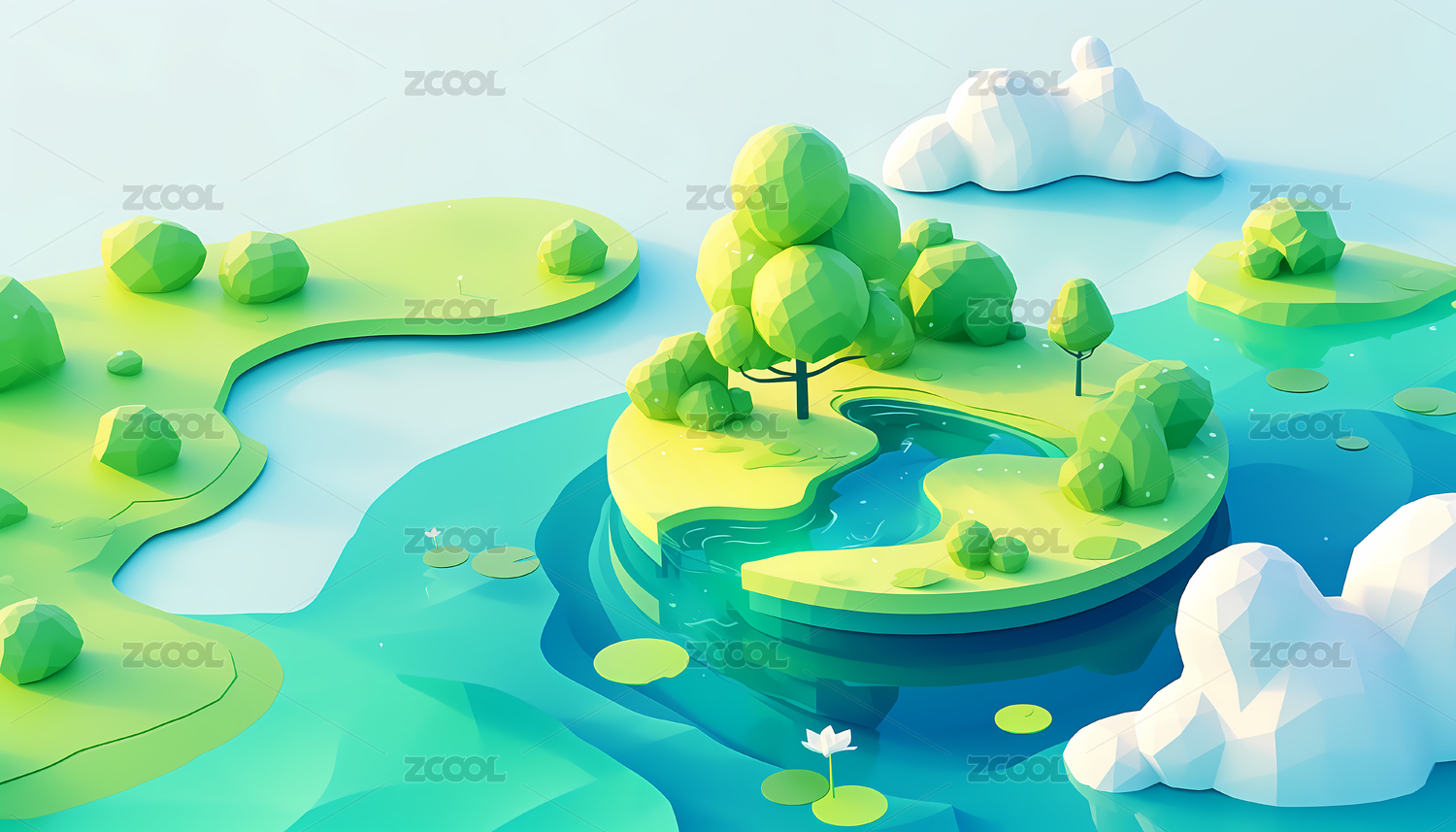 绿色草地树木河流云朵春天湿地3D插画