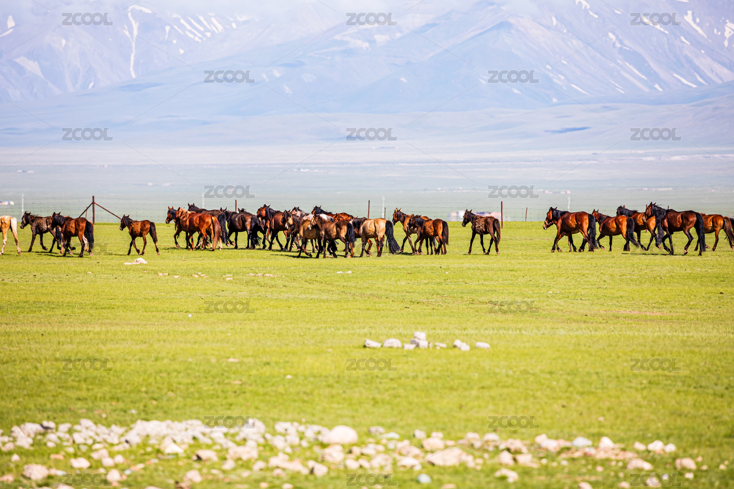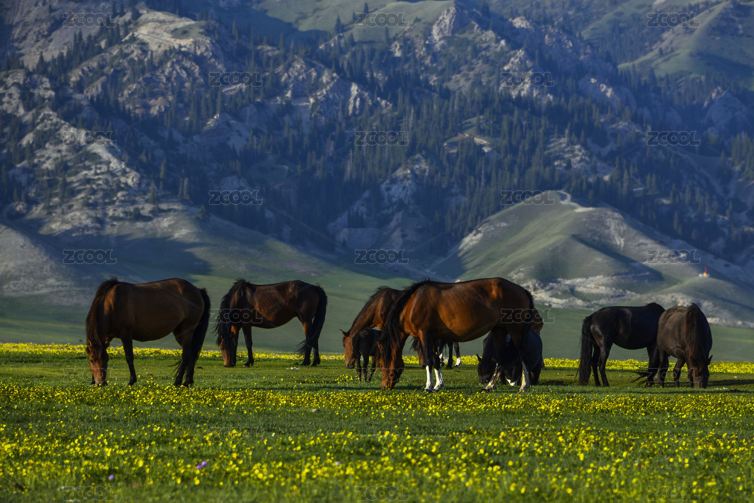 中国新疆伊犁喀拉峻草原农场马匹自然风光