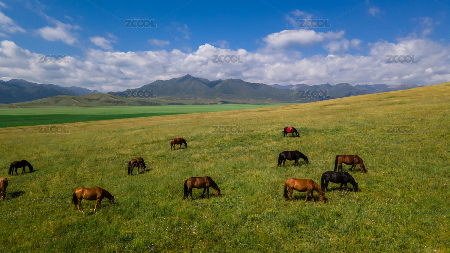 新疆伊犁喀拉峻草原农场马匹自然风光航拍