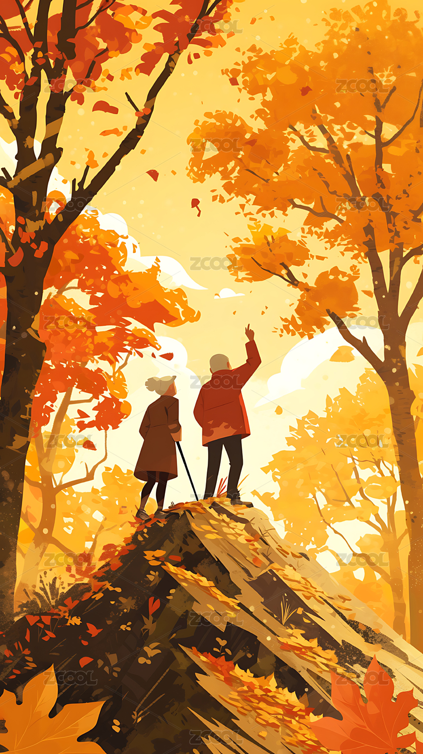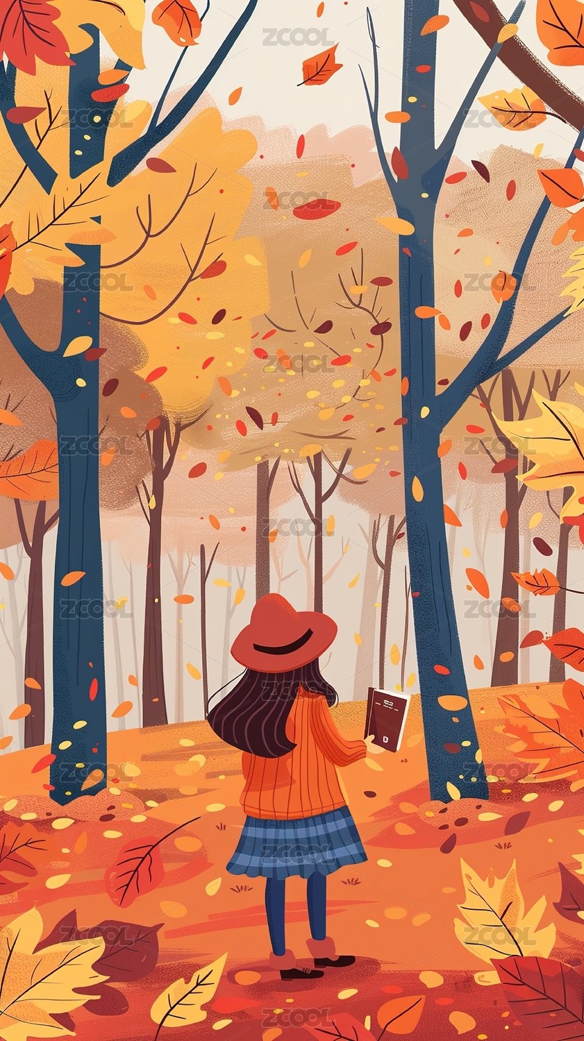 秋天扁平人物插画落叶暖色场景壁纸竖版
