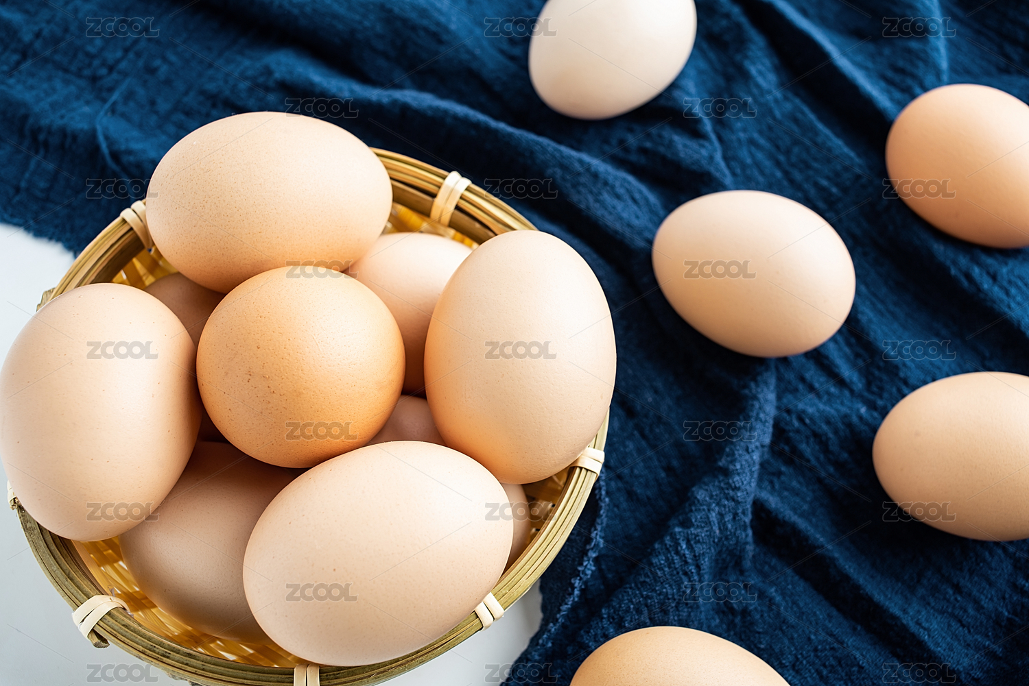 木质底纹上的竹笸箩装满了美味的油鸡蛋