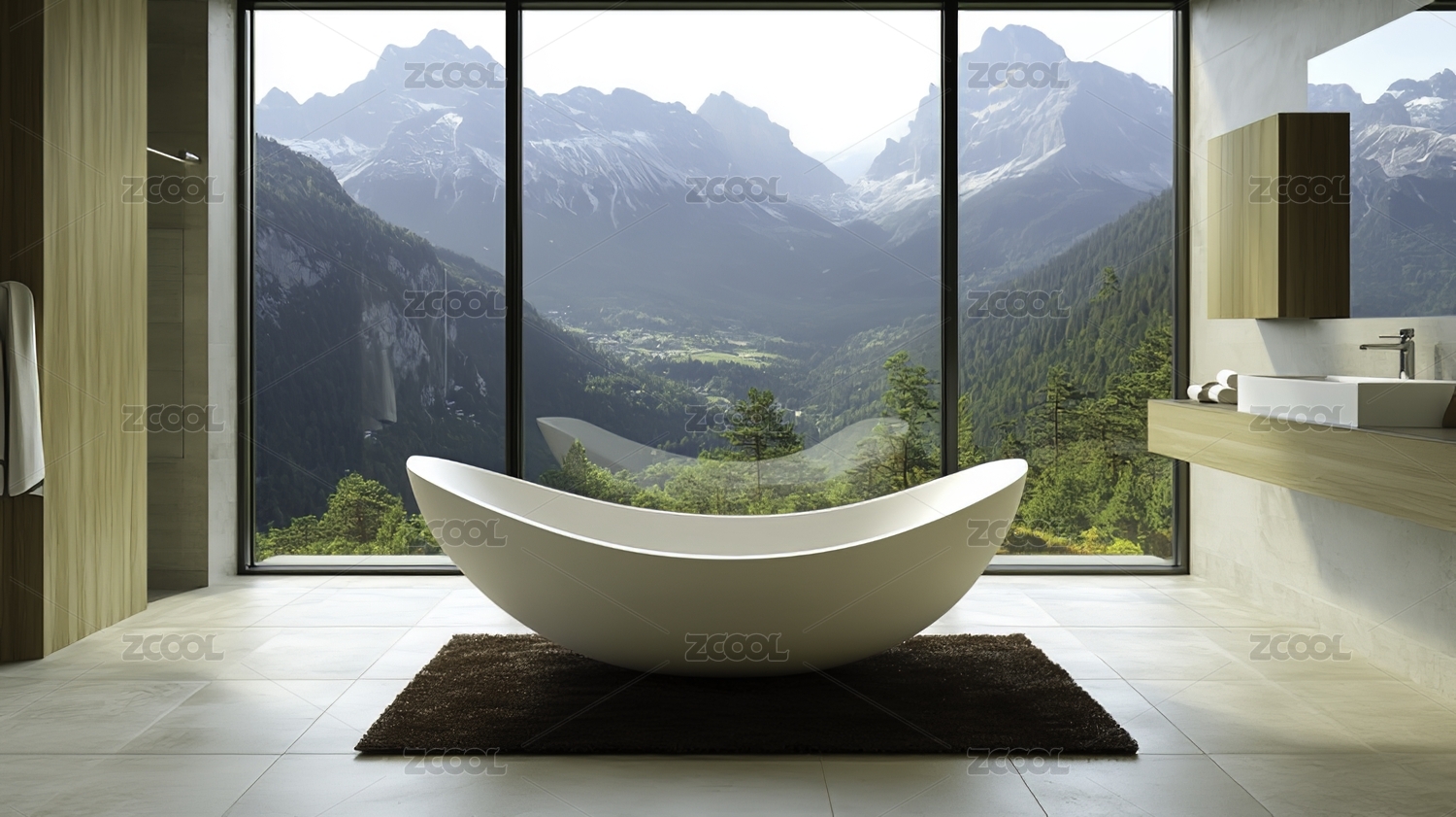 浴室,浴缸,窗户,落地窗,群山,极简,宽敞,独立,独立式,视野