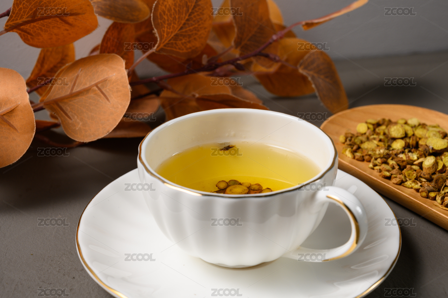 桌面上的杯子里的甘甜可口的赶黄草茶