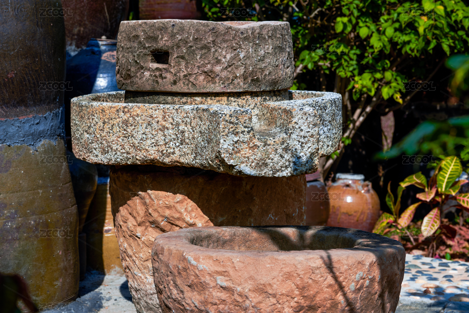 中国山东省临沂市沂蒙红色影视基地内沂蒙山村的石碾子