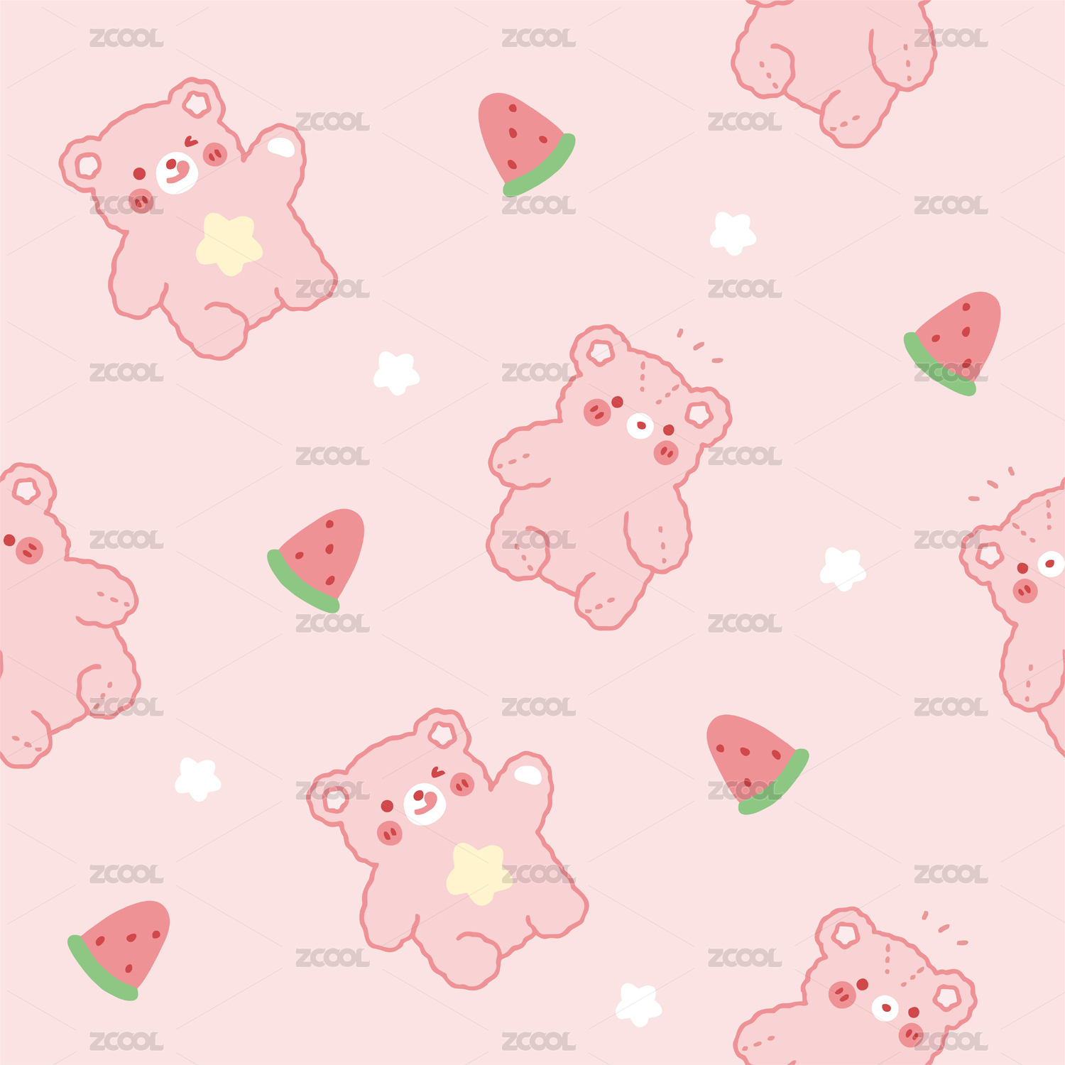 儿童可爱粉色小熊西瓜无缝矢量印刷背景