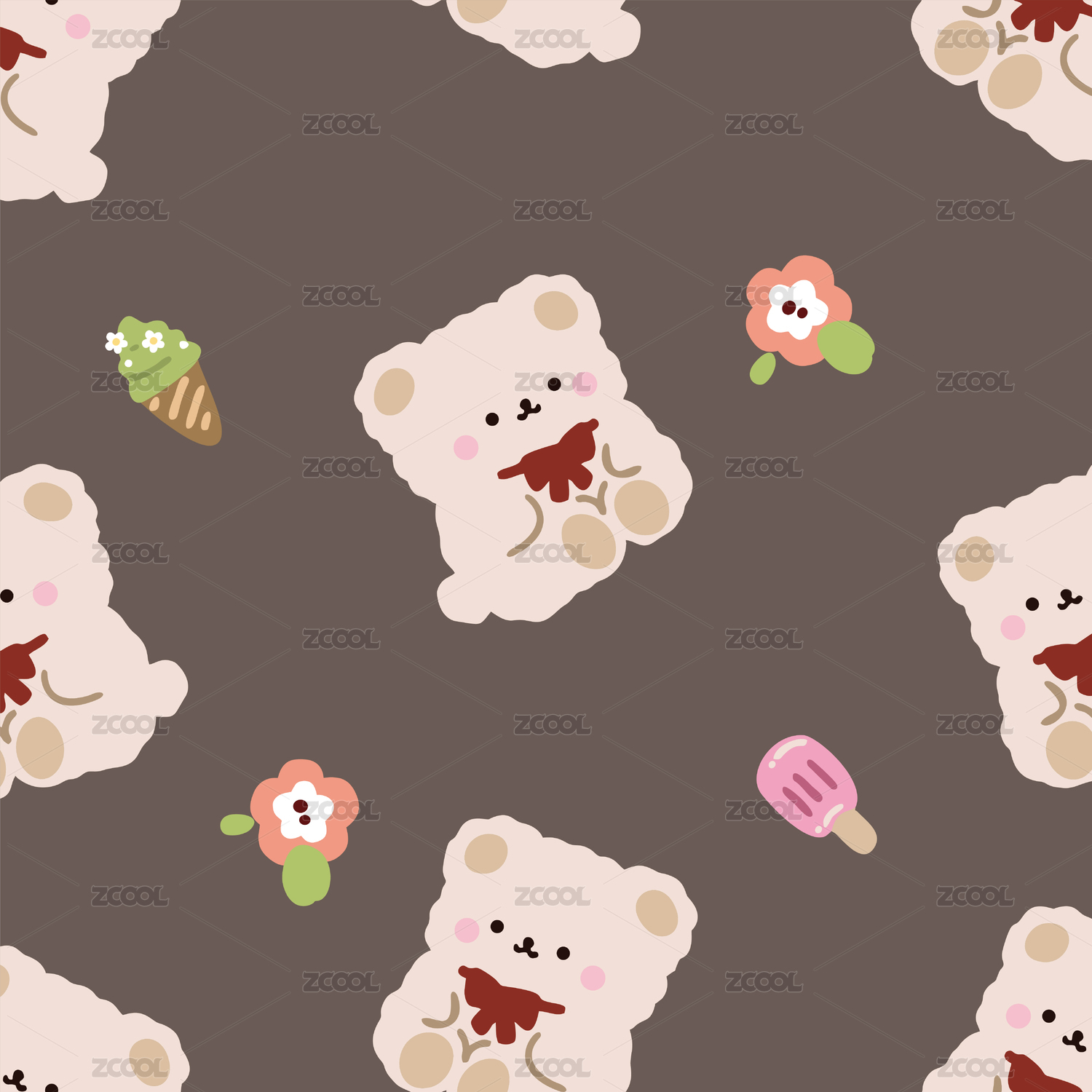 儿童可爱卡通小熊无缝四方连续背后印花