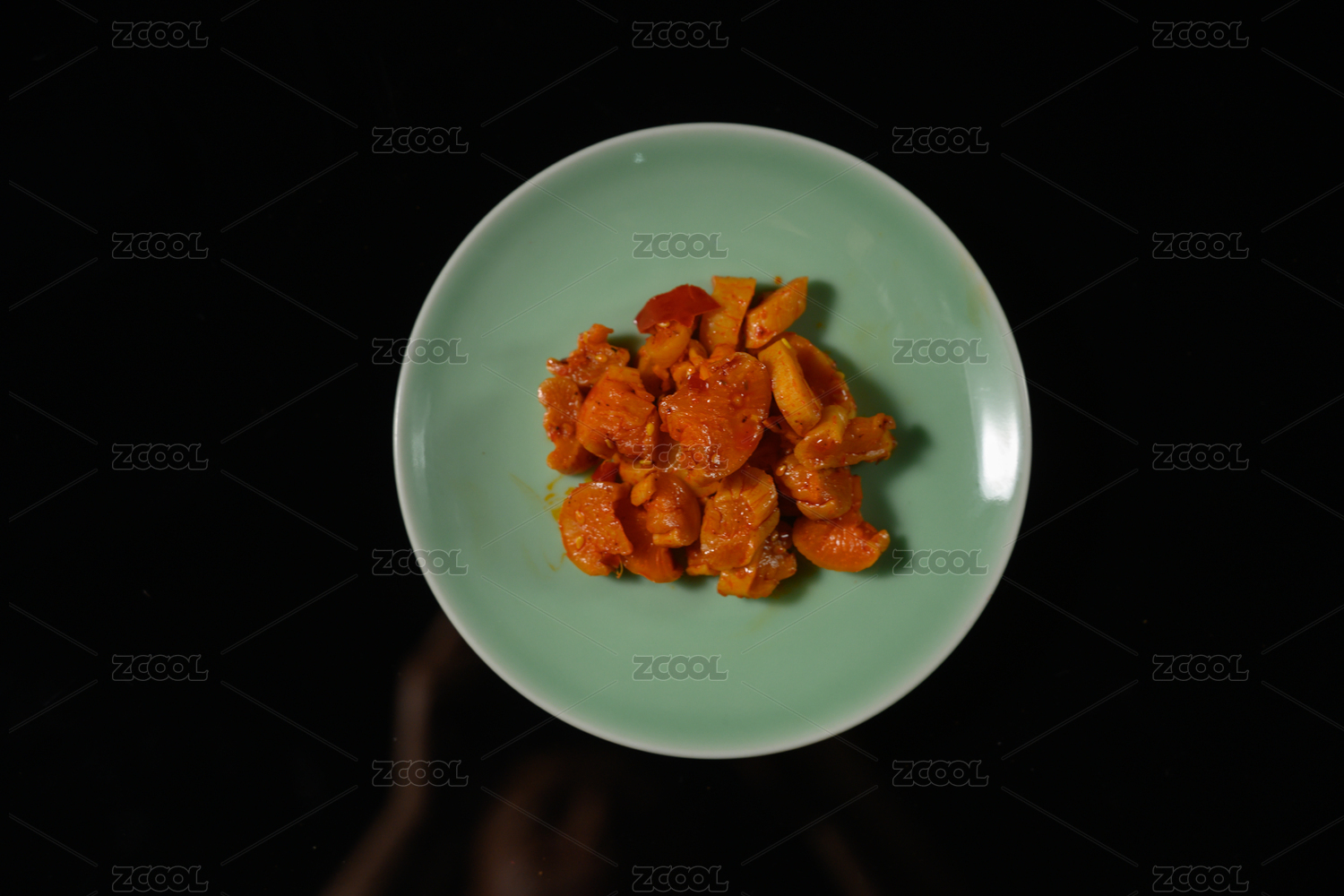 桌面上的盘子里的美味可口的香辣萝卜丁