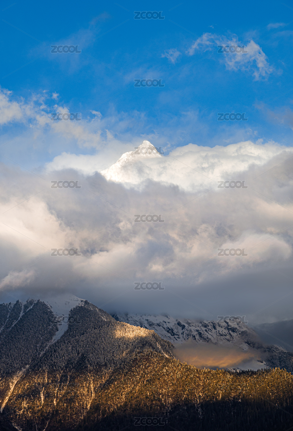 晴空多云笼罩的梅里雪山卡瓦格博峰顶及山坡