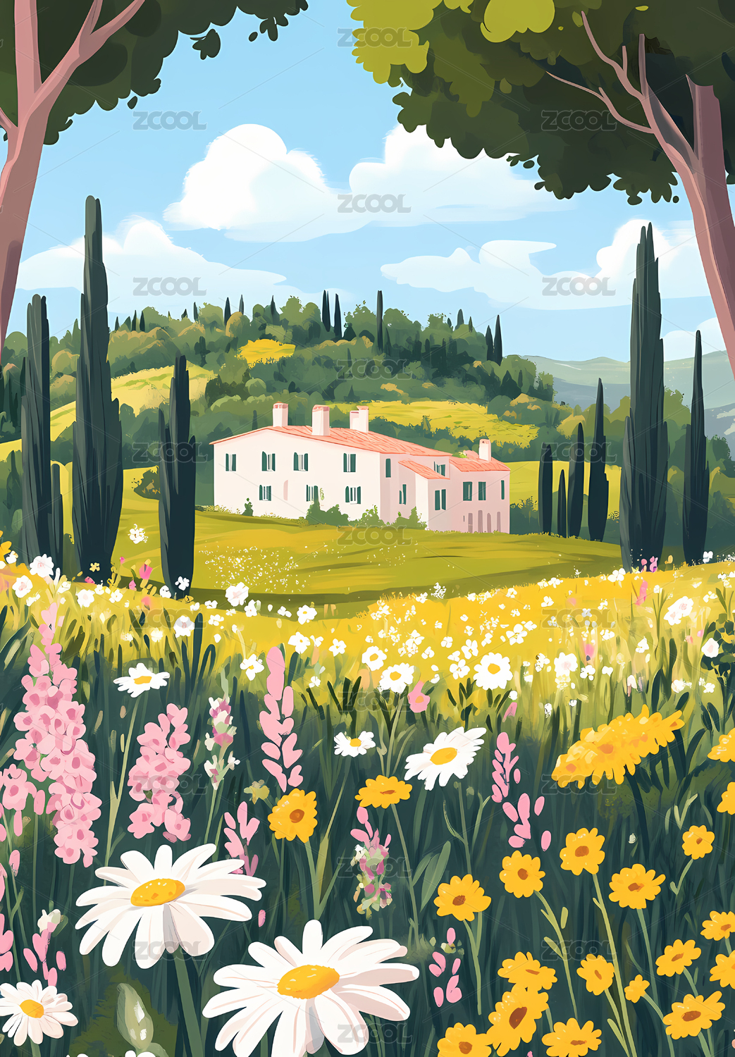 房屋,教堂,鲜花,树木,风景画,绘本插画