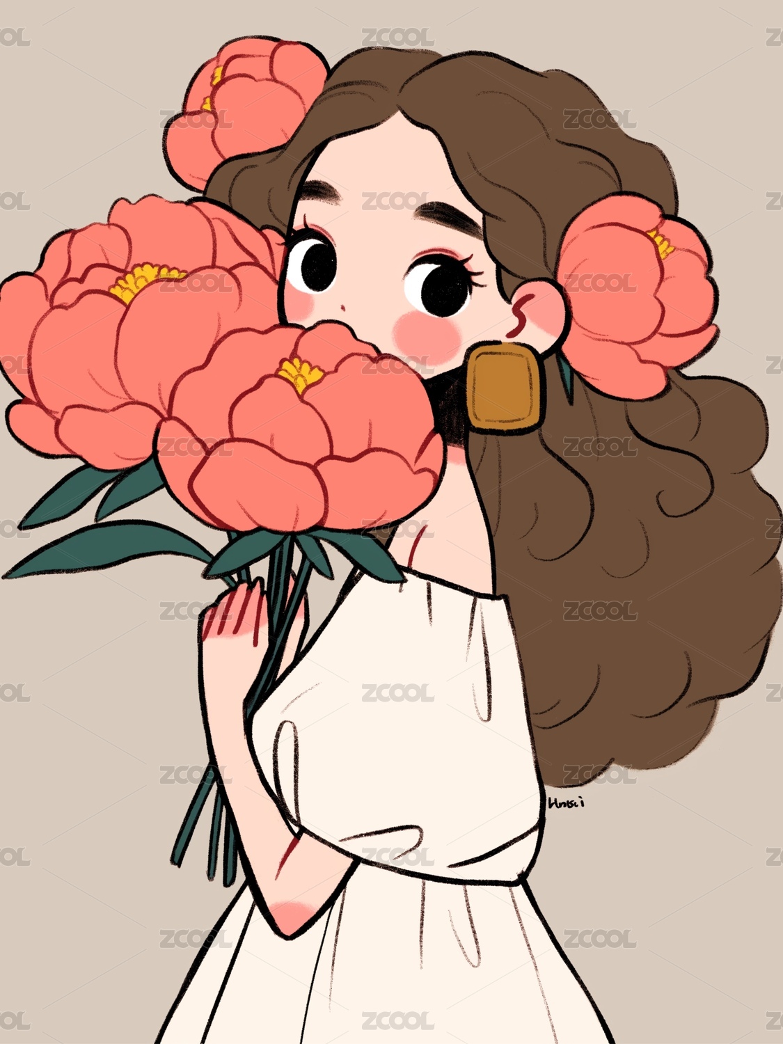 芍药,鲜花,少女,插画,彩铅风,可爱,治愈系