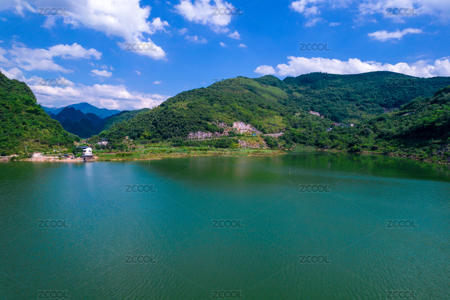 蓝天白云下的湖光山色美景