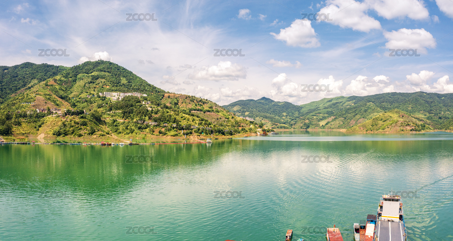 河流,水域,绿化,山林,蓝天,白云,多云,户外,大自然,天空