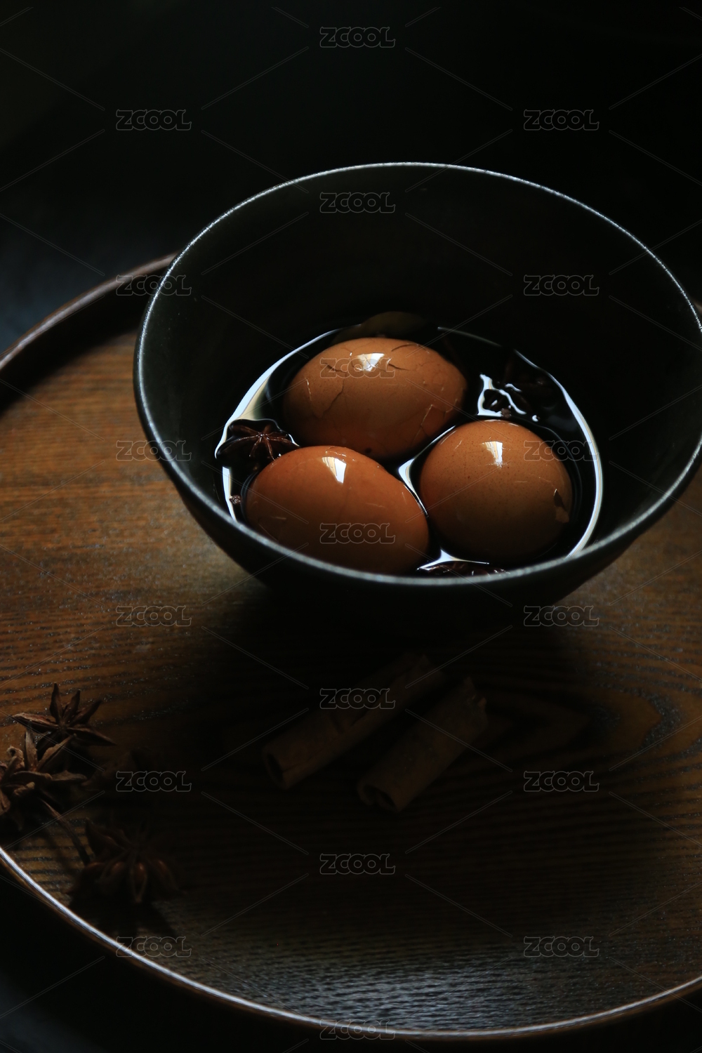 圆形托盘上黑色陶碗中的三个茶叶蛋