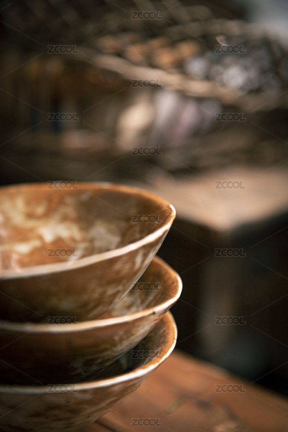 传统复古的餐桌上,放着许多碗筷等生活用品