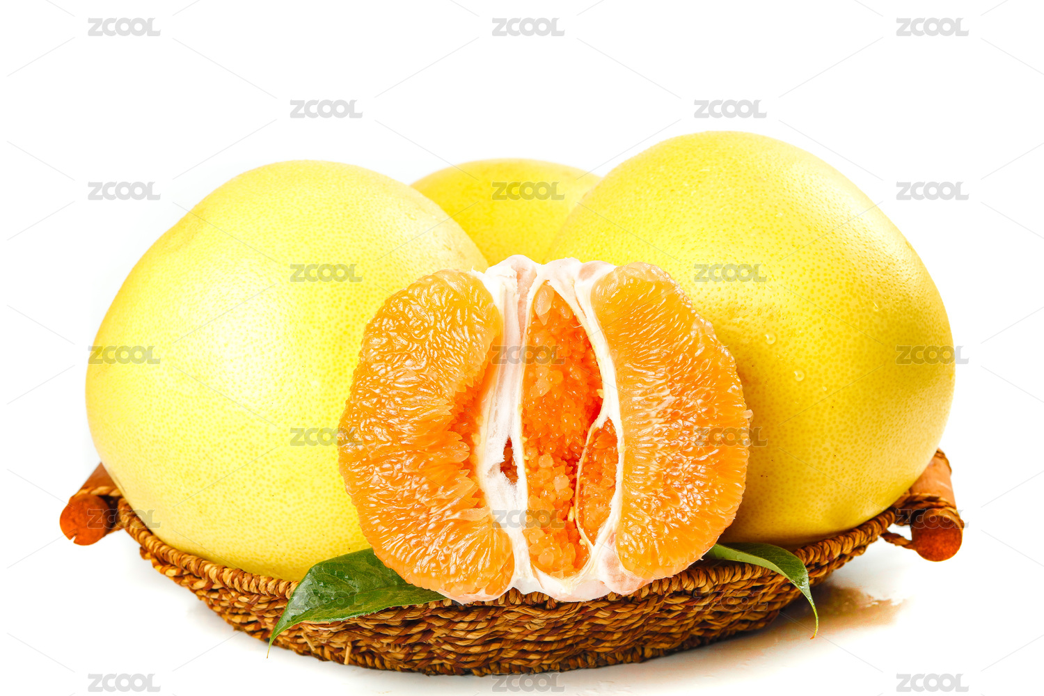 白底上放着一个黄金柚和半边剥皮的黄肉蜜柚