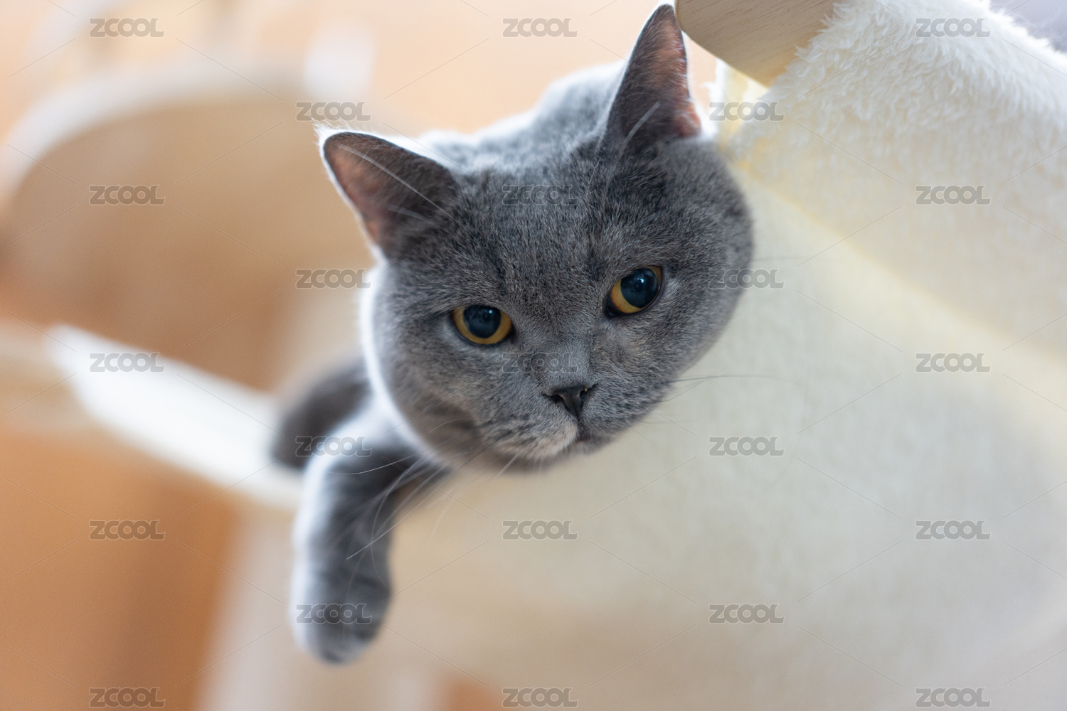周日时英国短毛猫躺在猫吊床上好奇看着前方
