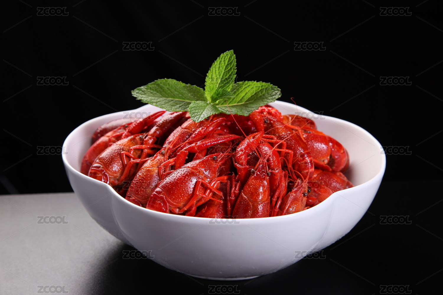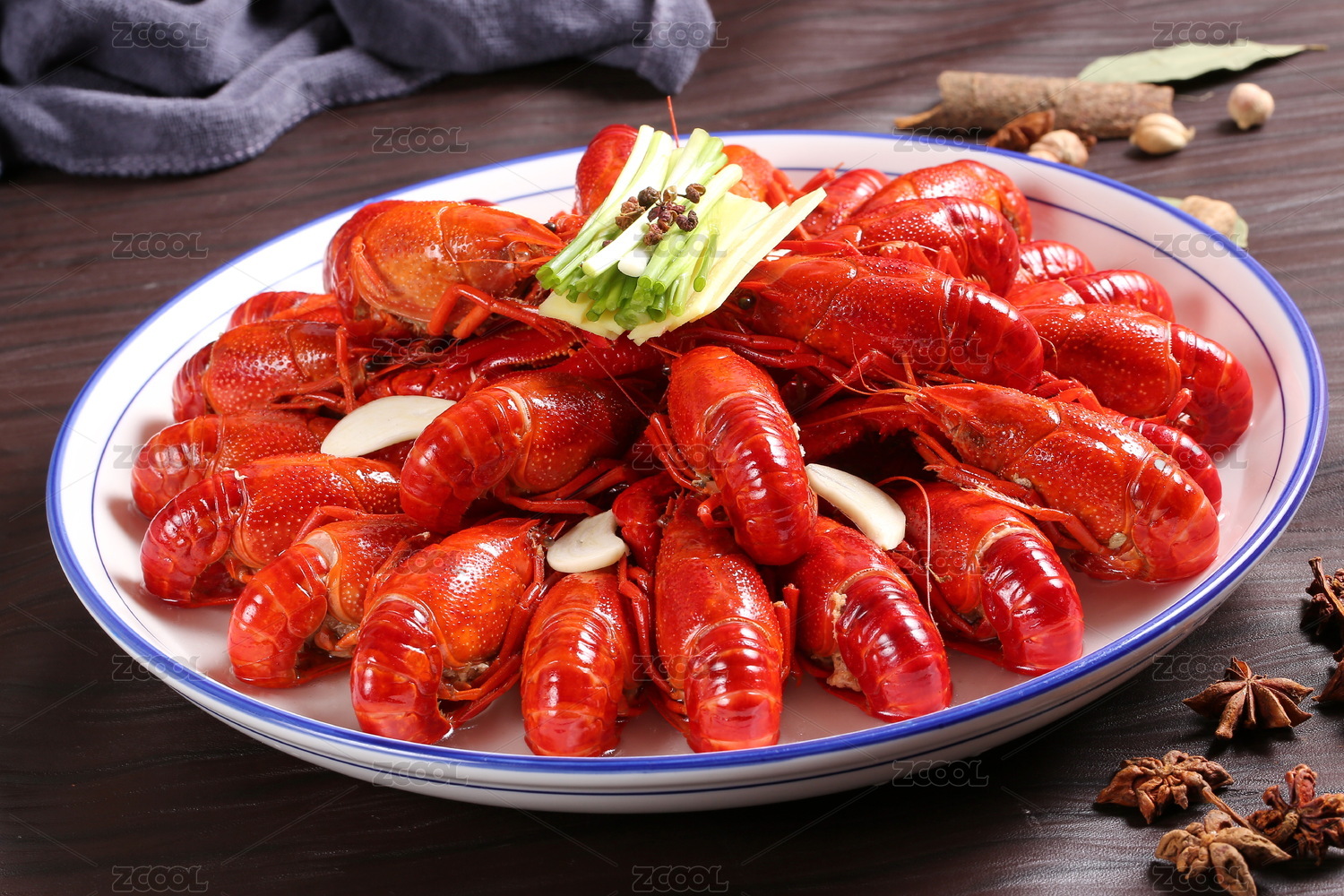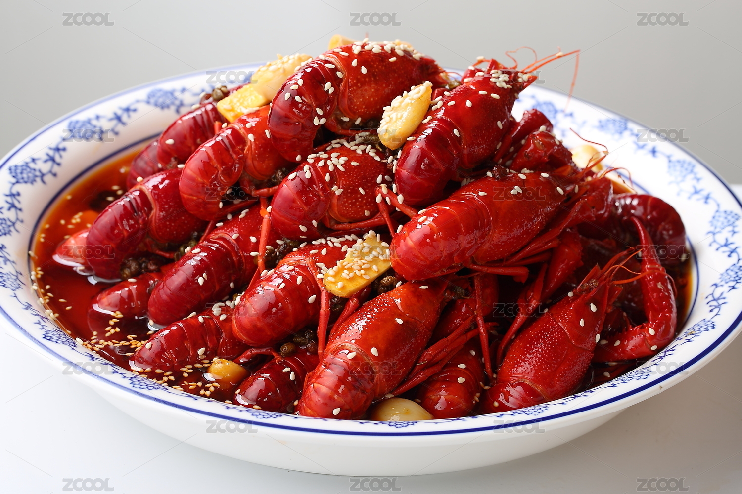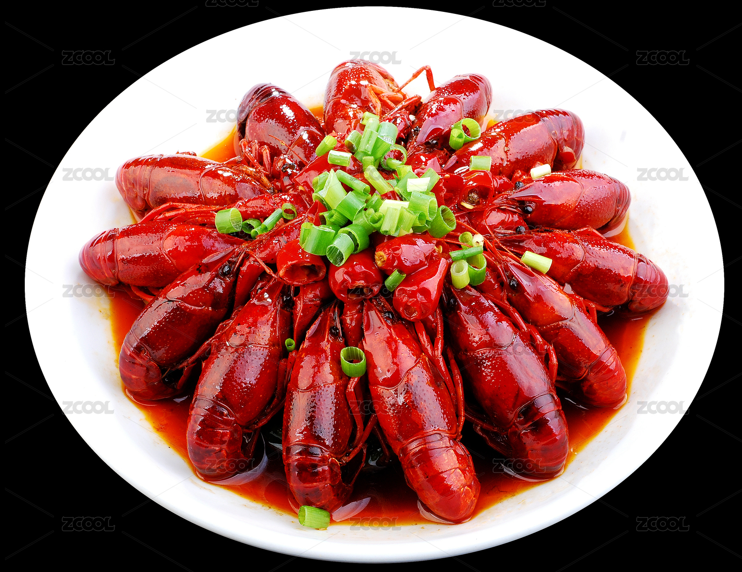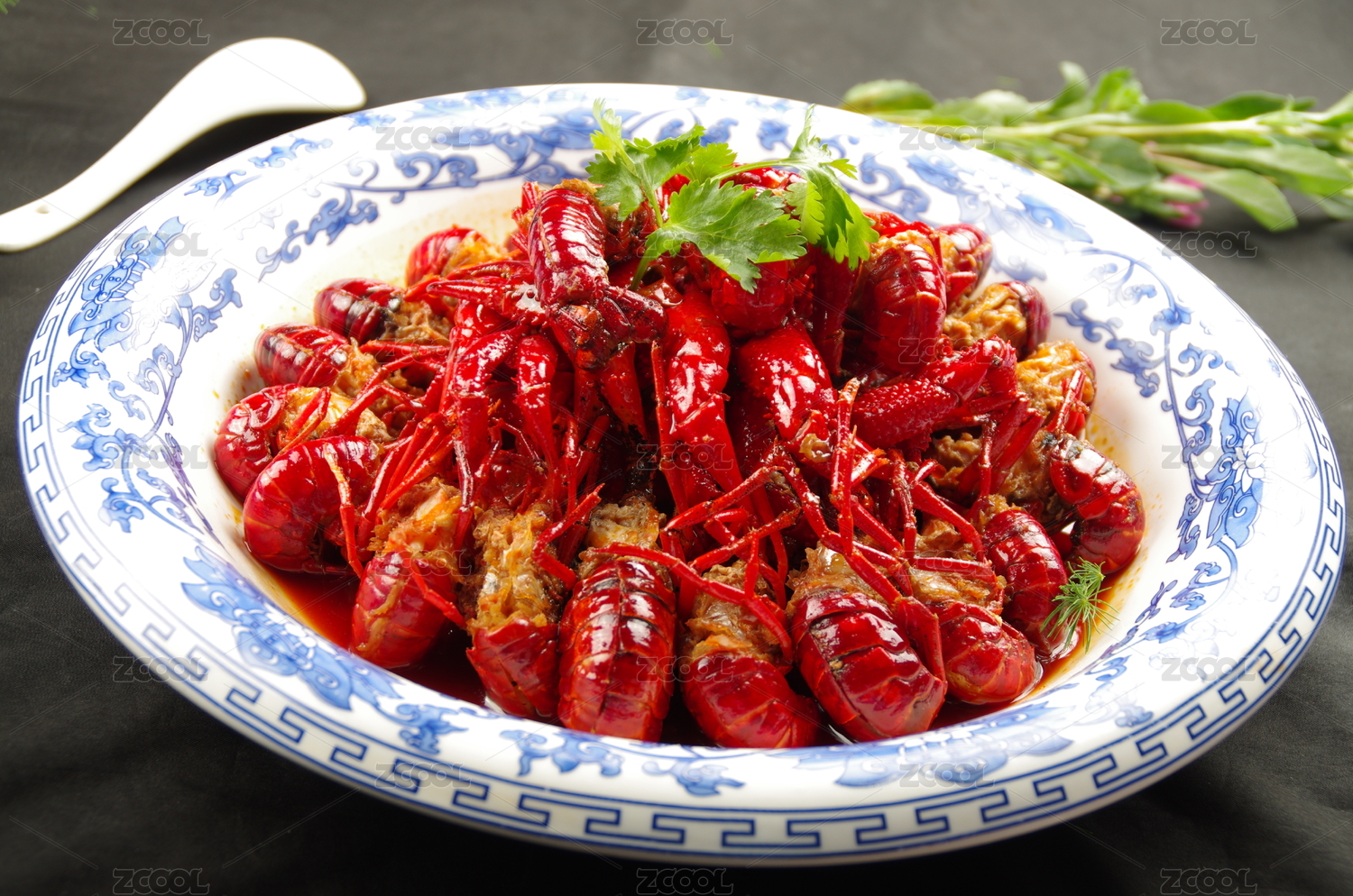 深色背景上一盘油焖大虾,上面点缀着香菜