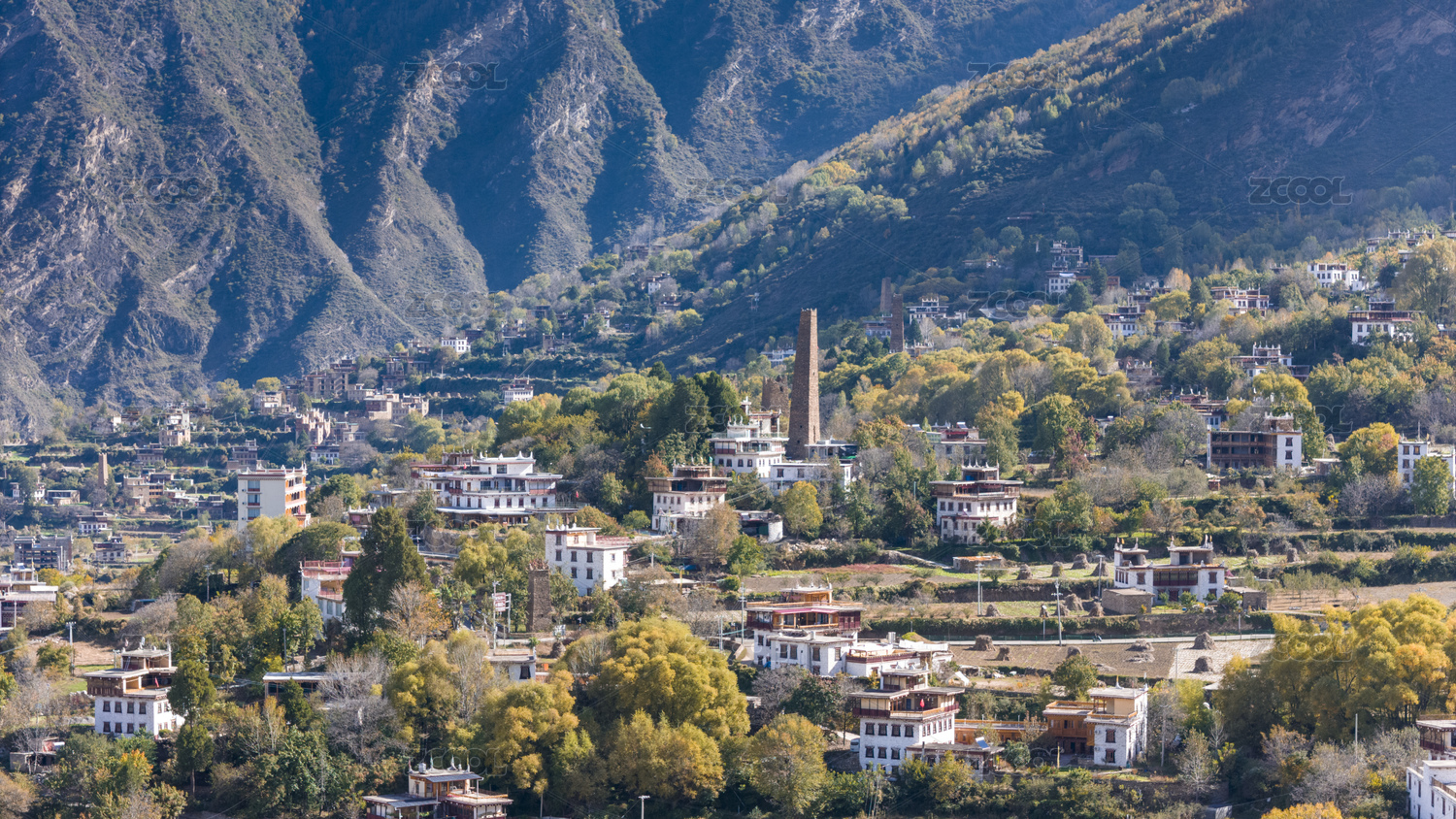 中国四川甘孜丹巴中路藏寨的彩林秋色