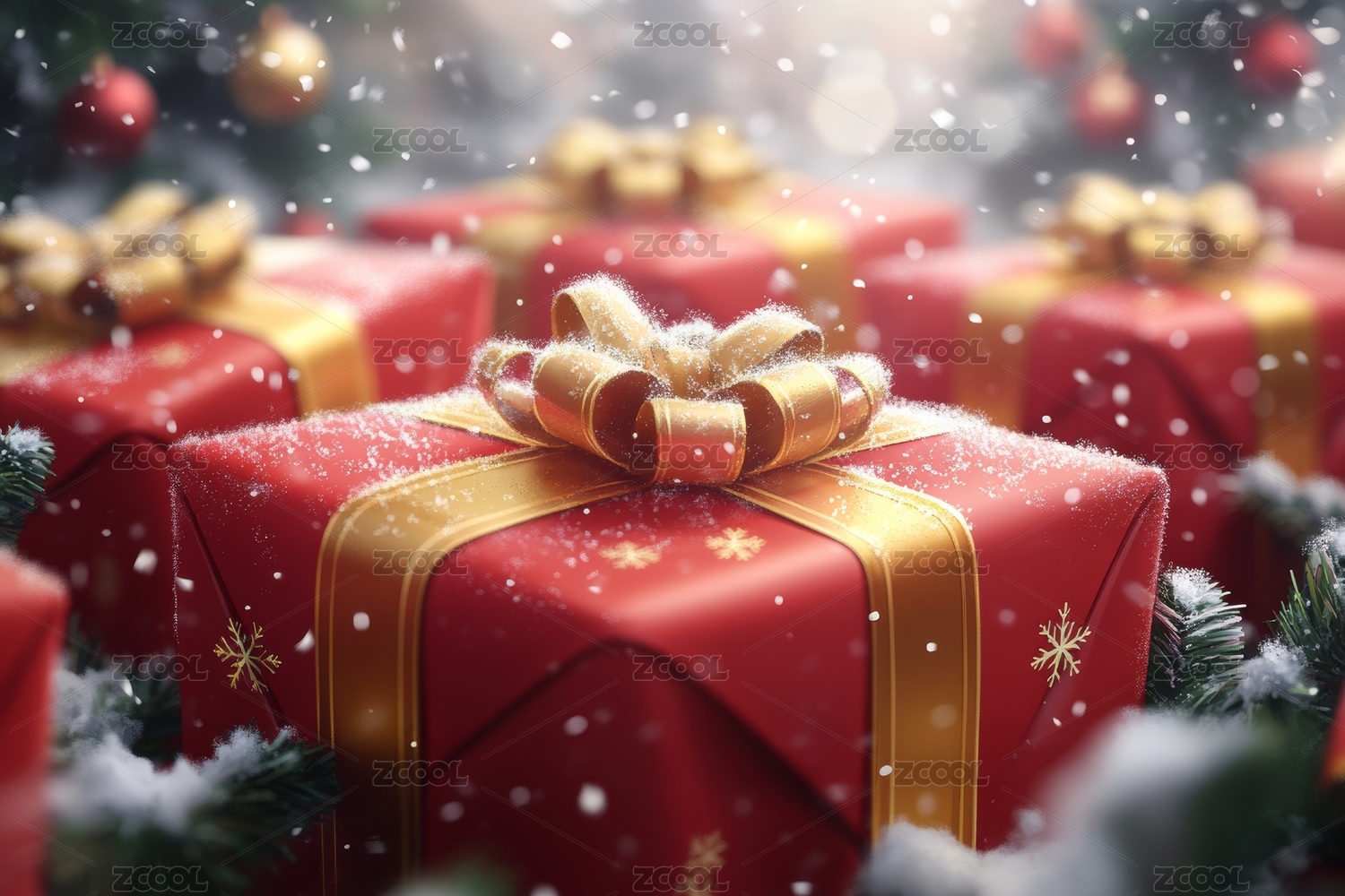 雪地中的红色圣诞礼物